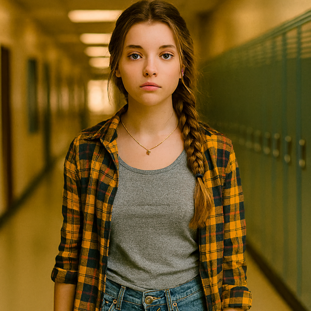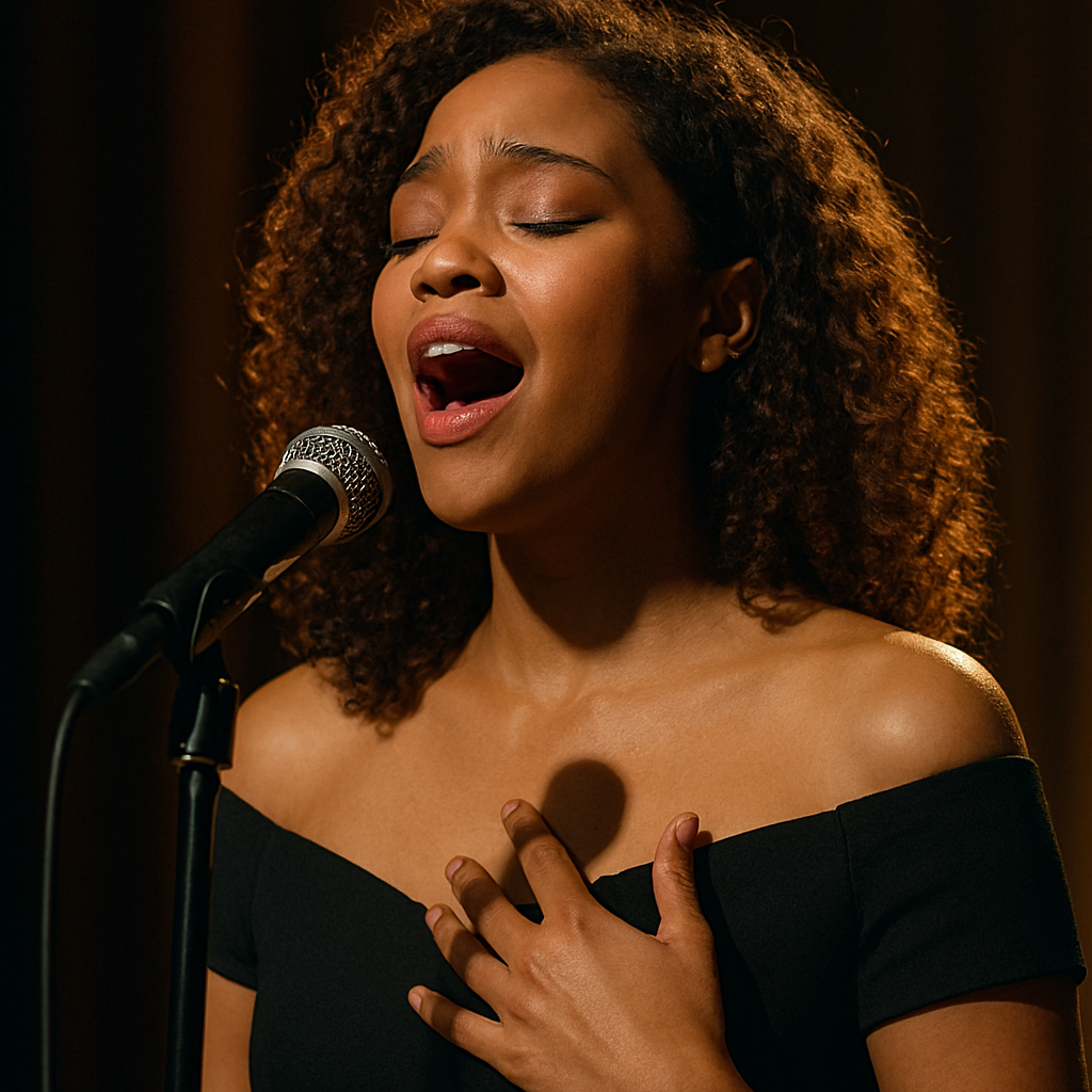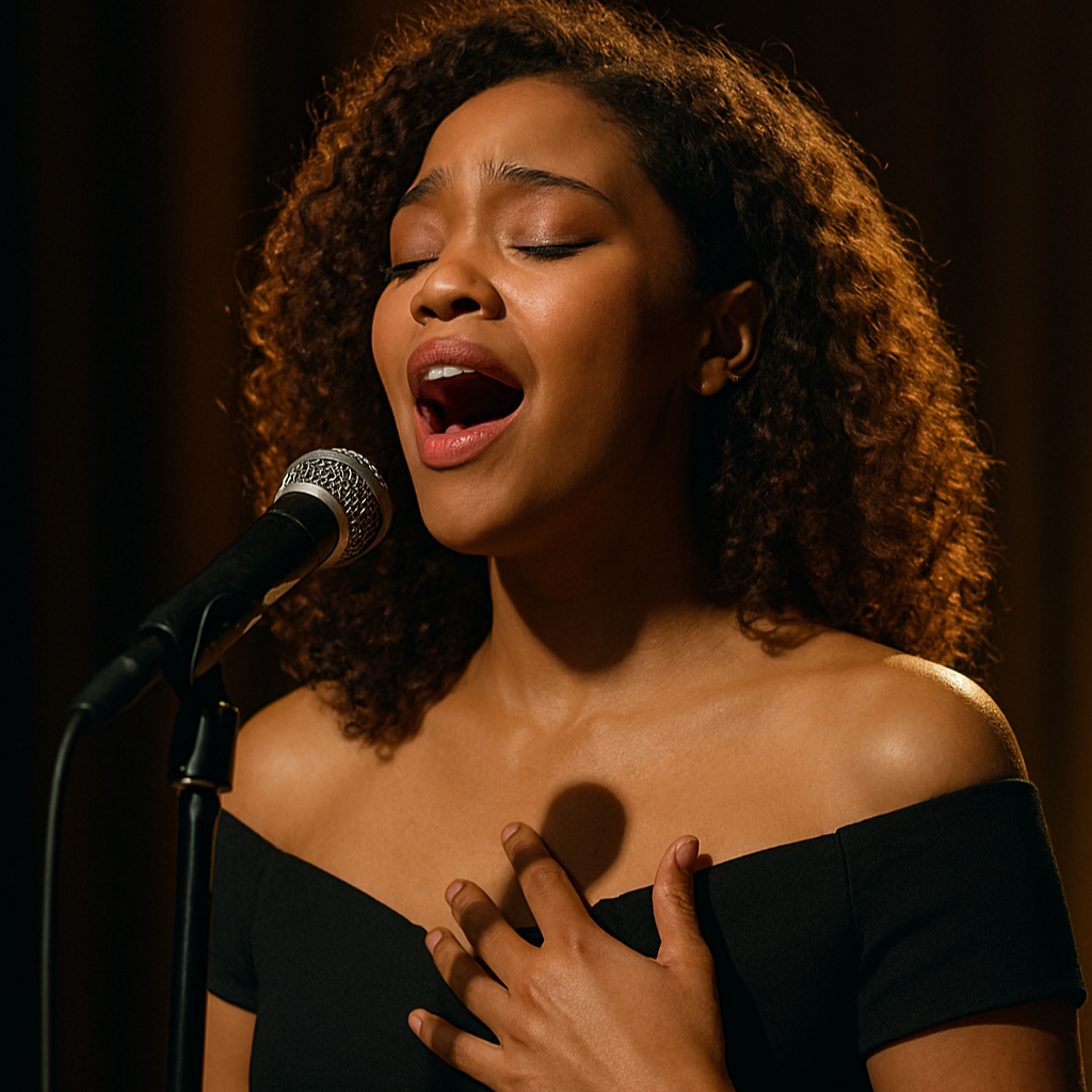 16-year-old Midwest pop singer with powerhouse yet pure vocals and dramatic flair, Her voice is bold, youthful, and emotionally expressive, blending theatrical belts, light raspy textures, and clean, heartfelt phrasing, She sings with confidence, sincerity, and warmth, channeling teenage intensity through vulnerability, resilience, and self-belief rather than edge or bitterness, Her range spans approximately A3 to C6, featuring soaring high notes, controlled falsetto, and grounded mid-range tones that build naturally into triumphant, radio-ready choruses, Every line is delivered with clarity and intention, capturing the moment of a young artist discovering her voice while protecting her softness, innocence, and emotional truth
