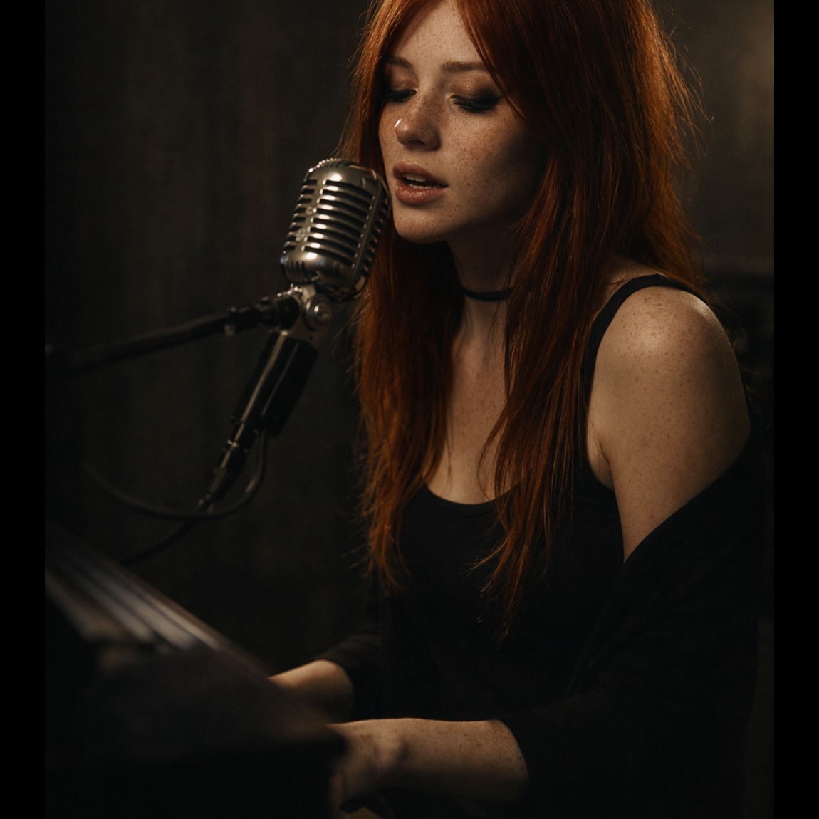 A dark, stripped-back Contemporary R&B, Soul, Pop Ballad at 74 BPM, Starts intimate: close-mic’d grand piano, warm sub bass, crisp dry snare, sparse hi-hats, subtle pads, The verse is gentle, breathy, exploring A3–C4, Pre-chorus subtly lifts, dynamics increase, Chorus bursts into layered harmonies, full piano chords, bold bass, gospel-influenced lead (D4–F5), agile melisma, playful ad-libs, Final “you” soars F5–G5, electric vocal run, falsetto echo, Sparse mix highlights a bright, sensual, confident female vocal; call-and-response ad-libs punctuate