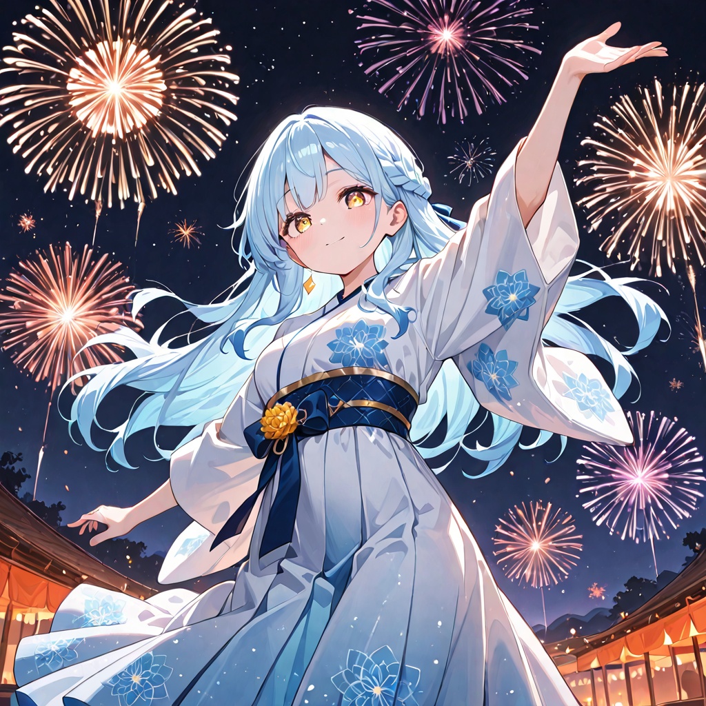 J-pop, piano, majestic sound, ambient, masterpiece, high quality, girl song, japanese, A gentle warm and expressive clear beautiful female voice, Expressing summer fireworks and nostalgia, A sound that spreads and shines brightly like fireworks, clear and beautiful band sound, BPM:130
