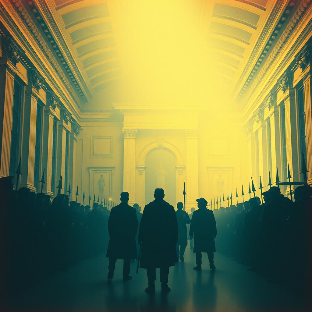 Slow epic symphonic rock ballad at 72 BPM, Starts with dramatic Hammond organ chords with cathedral reverb, harmonized distorted guitar riffs, timpani rolls, brass stabs, and swelling choir, Builds gradually with piano arpeggios and lush strings into a massive cinematic arrangement with electric guitars, bass, timpani, brass accents, Hammond organ, and full rock drums, Dramatic, expressive male lead vocal with theatrical delivery and rich reverb, supported by multi-layered harmonies and a powerful choir in the chorus, Extended bridge with spoken and sung lines, orchestral swells, Hammond organ climaxes, rising tension, and guitar tremolo picking, Huge final chorus with choir fortissimo, soaring guitar solo, organ blasting full chords, and wide stereo mix, Strong dynamic rises and falls, bombastic and theatrical atmosphere