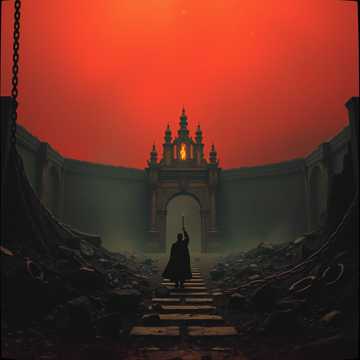 and male vocals that alternate between guttural roars and soaring, a haunting bluesy lead guitar melody, heavy blues, blues, crushing riffs with down-tuned guitars, thunderous drums, epic metal; slow, doom metal, metal, operatic highs, layered with a sense of foreboding and triumphant despair