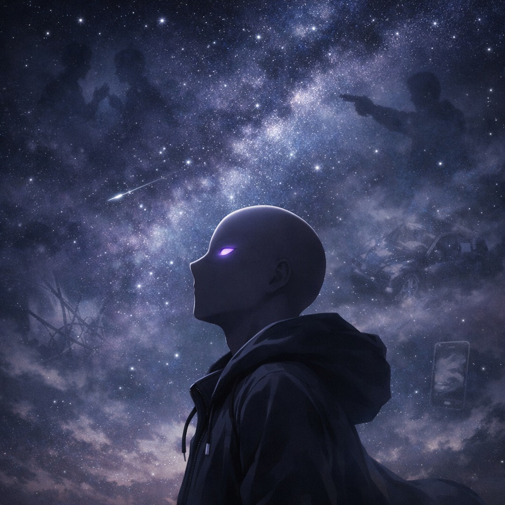 This Emo-Trap track features a slow, dragging vibe at 70 BPM, Deep, sliding 808s anchor the low end, paired with a reverbed sad guitar loop playing spacious chords, Ambient, wide synths create a misty atmosphere, while minimal trap drums use loose claps and muted hats, Subtle, glitched server noises and hints of midnight breeze deepen the mood throughout
