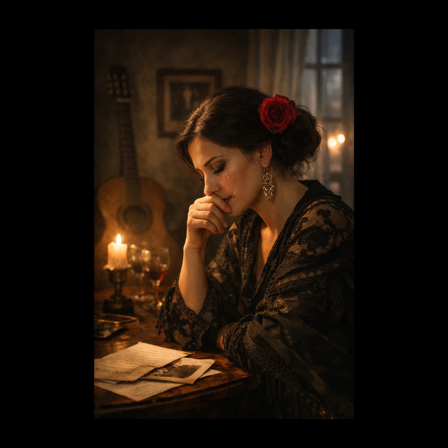 flamenco copla cinematic spanish ballad, dramatic emotional female vocal, powerful andalusian vocal style, spanish guitar piano orchestral strings cajon soft percussion ambient pads, slow passionate tempo, 74 bpm, key D minor, 4/4 time, expressive vibrato vocal performance, dramatic orchestral build, intimate verses growing into powerful chorus, emotional flamenco phrasing, cinematic spanish arrangement, warm analog mix, vocal forward, wide stereo strings, soft plate reverb, dynamic emotional climax, spanish guitar solo before final chorus, cinematic ending