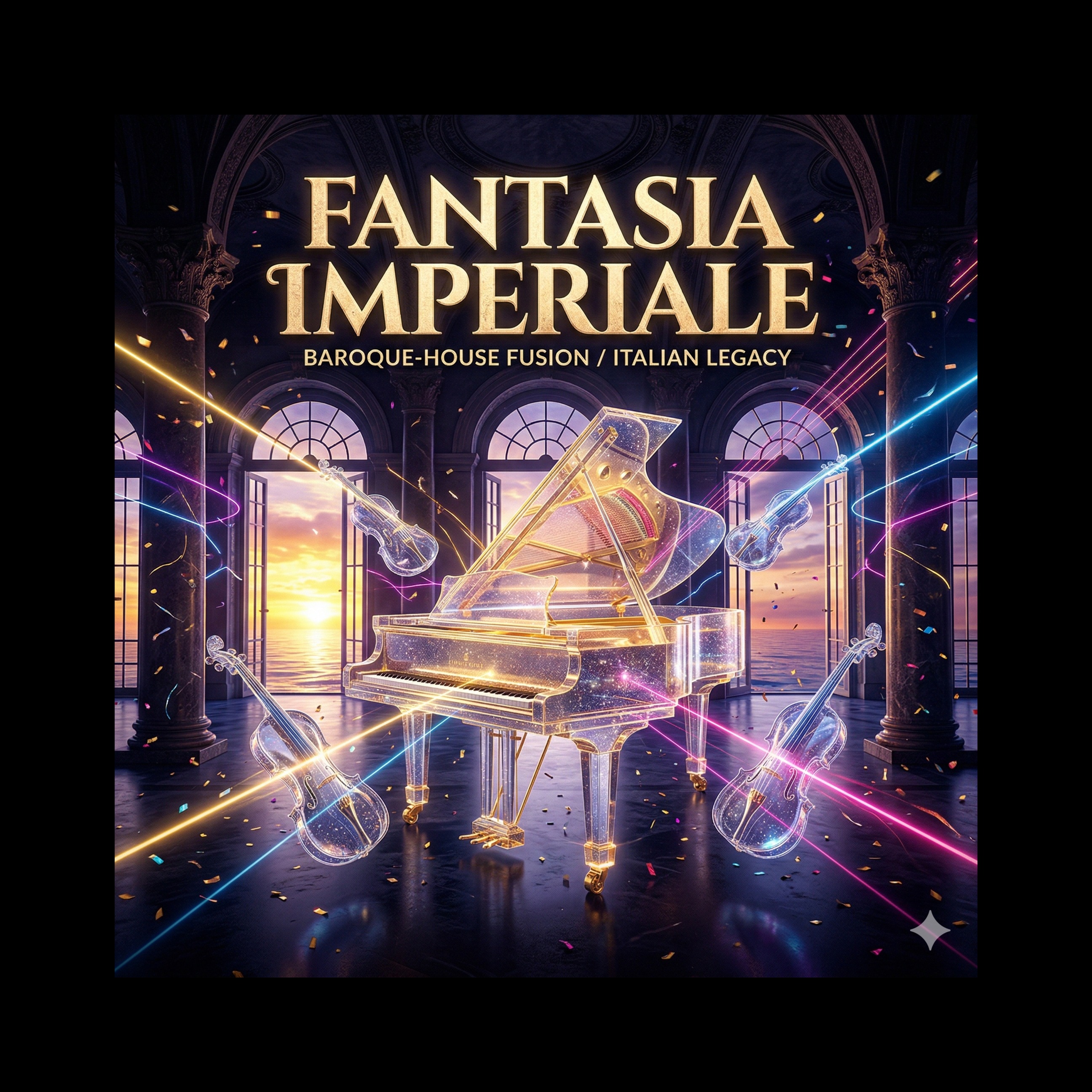 126 BPM, Italo House, stile anni '90, pianoforte guidato, brillante pianoforte da casa Korg M1, violini ritmici in stile barocco, archi Rondò Veneziano, accenti orchestrali staccati, linea di basso analogica rotolante, batteria Roland TR-909, charleston aperti e nitidi, campanaccio percussivo, archi ad alta fedeltà pieni di sentimento, autentico suono da club vintage, strumentale, senza voce