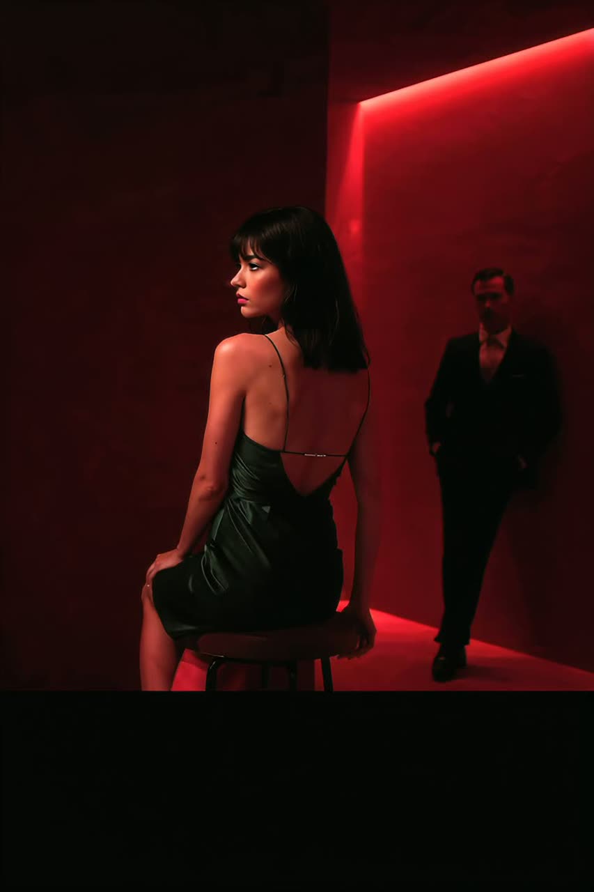Dark luxurious disco track, 118β122 BPM, steady four-on-the-floor groove with tight, hypnotic forward motion, Deep funk bassline, controlled and elegant, locked with vintage disco drums reinforced by modern low-end; crisp hi-hats with subtle swing and precision, Nocturnal strings move in slow, graceful arcs, creating tension through restraint rather than drama, Warm analog synths form circular, trance-like motifs, minimal yet insistent, Sparse filtered guitar stabs appear as rhythmic accents, understated and precise, Delivery is intimate and unhurried, mentally dominant without force, Backing vocals are minimal and airy, used sparingly in a call-and-follow pattern to reinforce inevitability rather than harmony, The chorus relies on repetition and groove, designed for immersion and loopability over melodic excess, Overall mood: luxurious, nocturnal, cerebral, dangerous through structure, Disco as a contained system: elegant, controlled