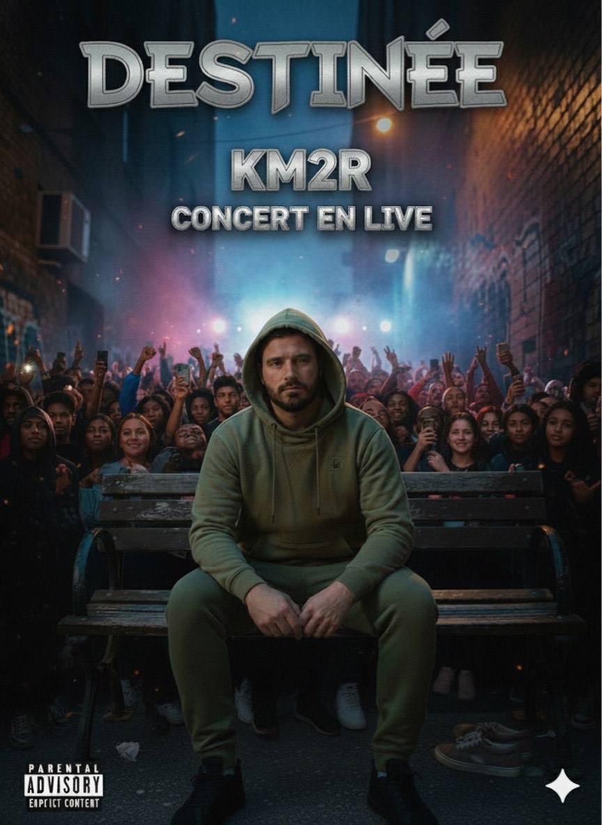 (Live concert )Rap sombre et réaliste style KM2R ambiance cité, violons mélancoliques + grosses basses, Flow posé mais intense, punchlines brutes, Ajoute des bruits de foule légère et quelques cris lointains, Beat lourd et rugueux, touches de platine scratch en outro, violon triste et des scratchs live