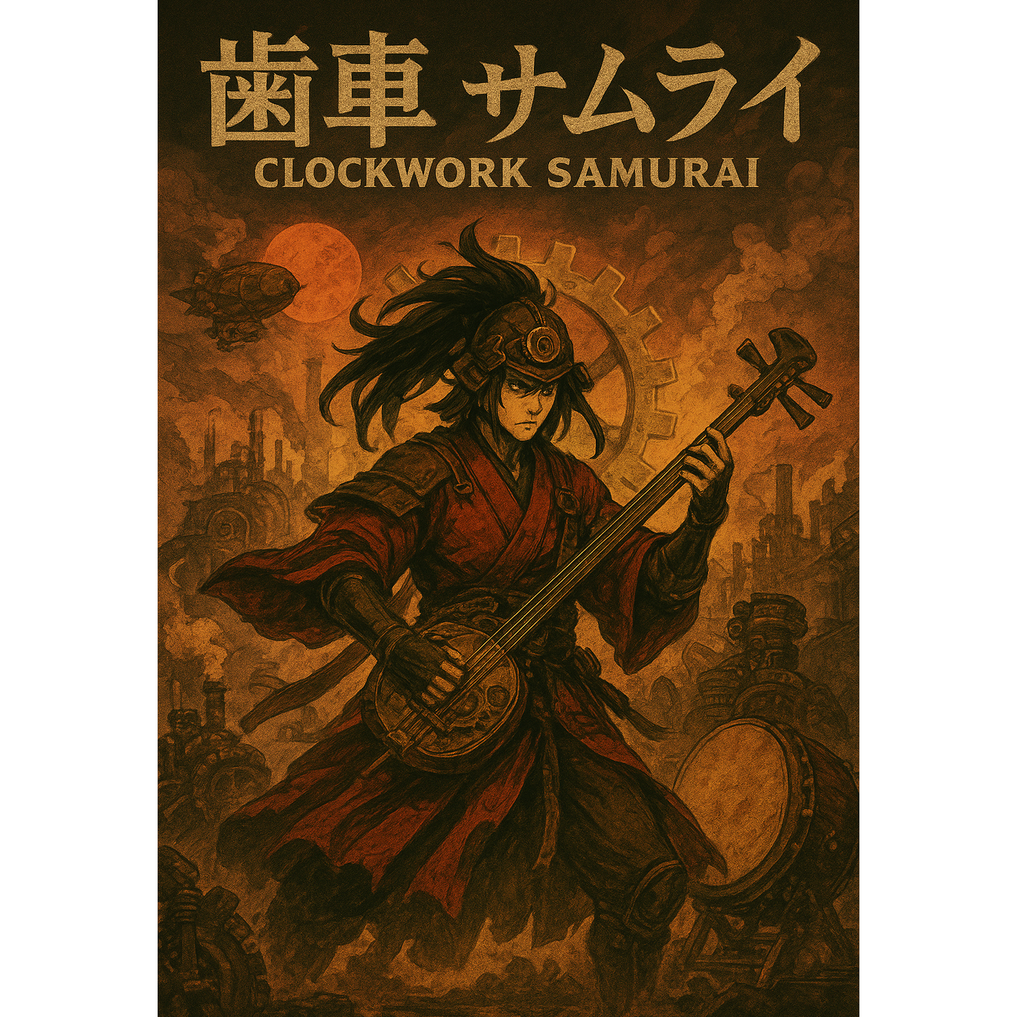 Oriental-infused Steampunk Rock, Features a fusion of electric guitars, taiko-inspired drumming, industrial FX (steam hissing, cog clanks), and melodic lines echoing traditional instruments like shamisen and erhu, Vocals are theatrical and intense, with moments of whispered narration and shouted group refrains