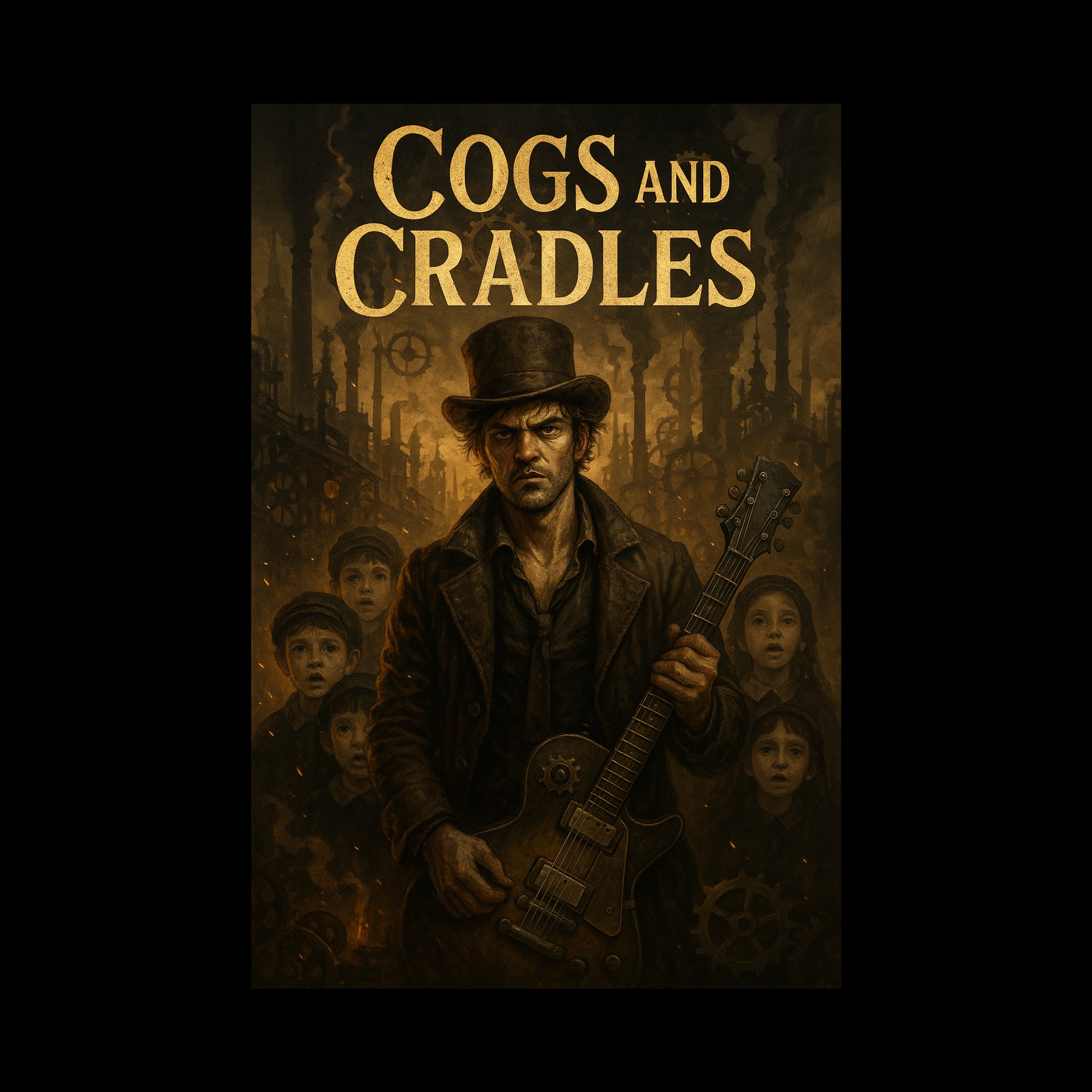 A raucous fusion of Steampunk Rock and Rap, Gritty guitars meet clanking pistons and industrial brass, Percussion is driven by metallic claps, coal-engine stomps, and clockwork-like snares, Rap verses are aggressive, theatrical, and swaggering; sung parts echo with old-world charm, The vibe is manic inventor meets anarchist poet — chaotic, clever, and full of punch