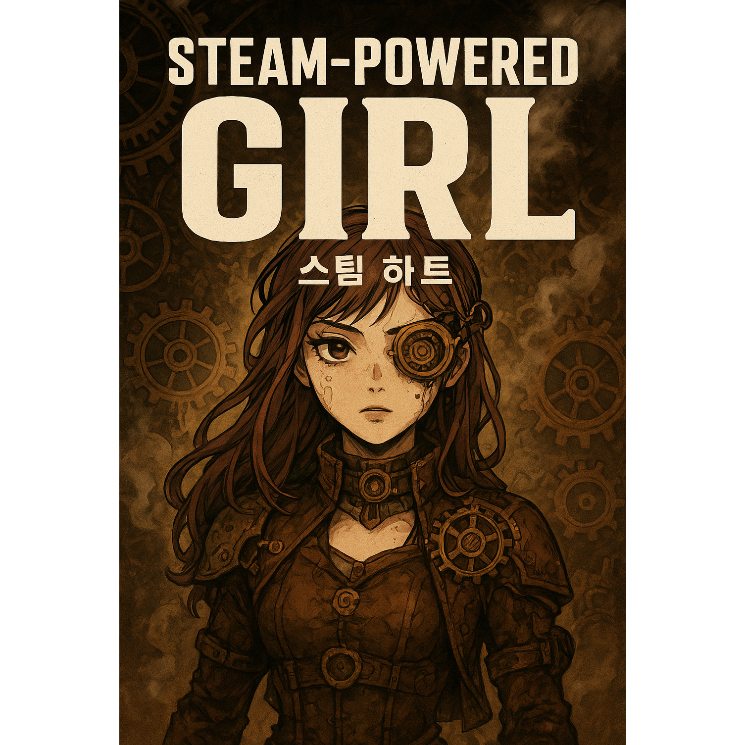 K-pop Steampunk Rock with industrial synth riffs, mechanical percussion, and distorted electric guitars, Verses alternate between English and Korean, blending cyberpunk energy with retro-Victorian steampunk aesthetics, The chorus hits like an anthem, fusing rock vocals with EDM-style drops and metal clanks over steam hiss effects
