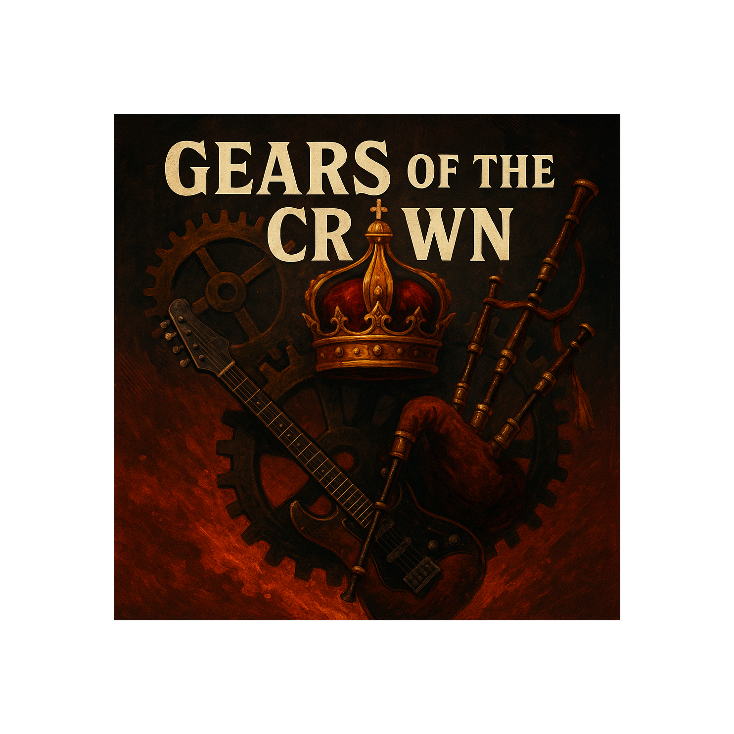 A fusion of medieval folk rock and gritty steampunk rock, Driving distorted guitars blend with lute, hurdy-gurdy, and bagpipes, layered over mechanical percussion and hissing steam valves, The rhythm swings between galloping folk patterns and pounding industrial rock beats, Vocals are bold and theatrical, telling the tale of a kingdom powered by clockwork and rebellion brewing in the shadows