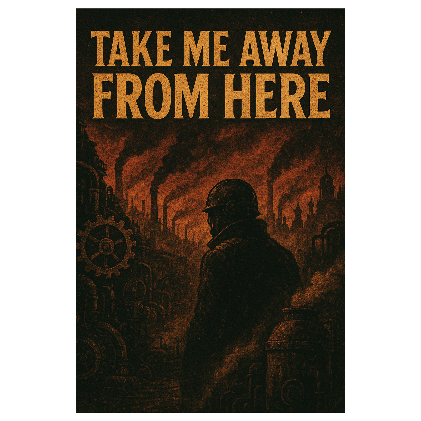 Steampunk rock with gritty overdriven guitars, metallic percussion, clanking machinery rhythms, steam-valve bursts, deep brass drones, and a marching industrial tempo, Vocals raw, defiant, and mechanical, with occasional gear-grind textures and industrial ambience