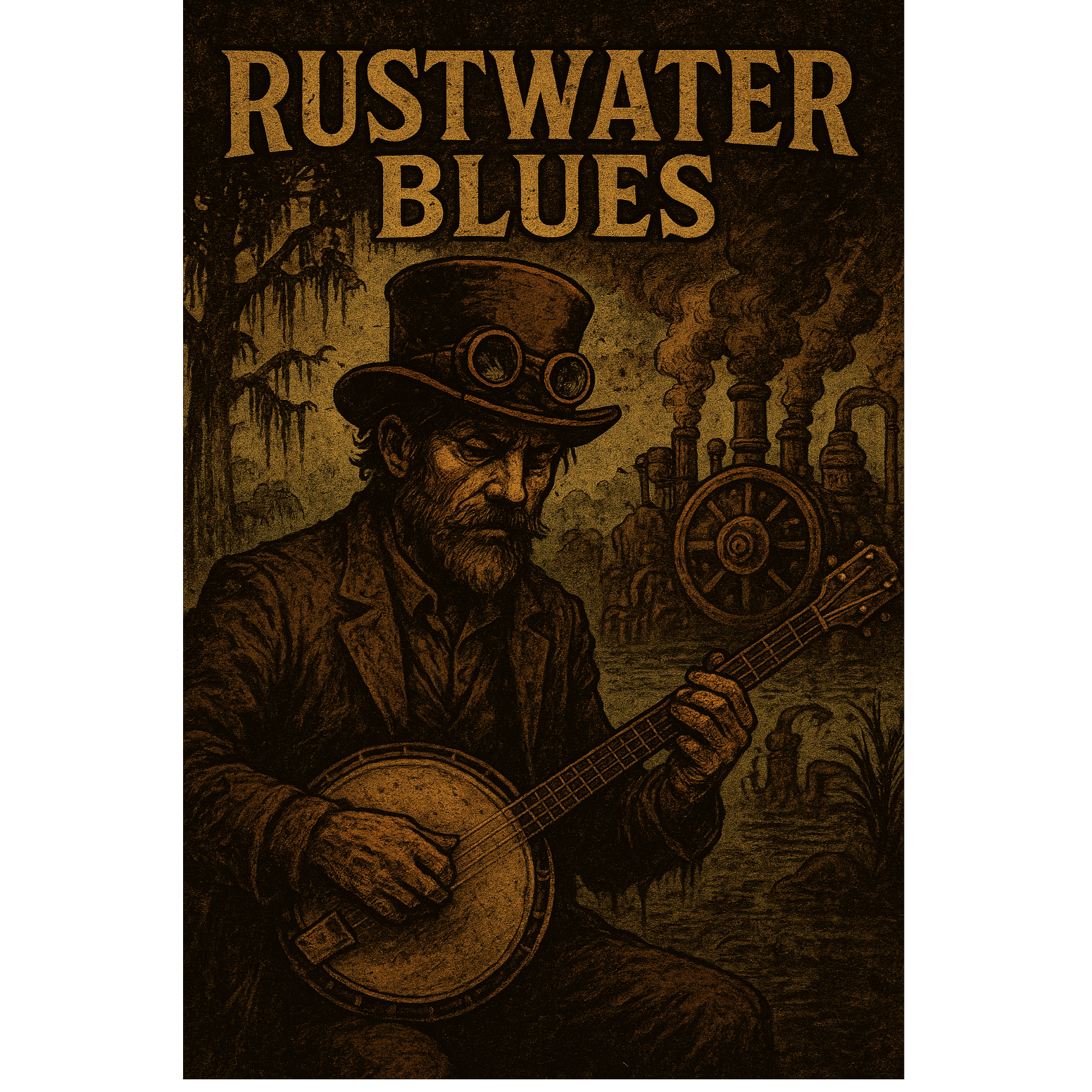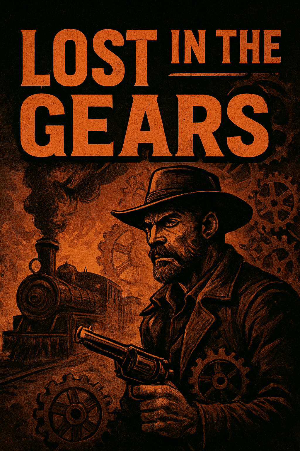 Gritty western steampunk hard rock – detuned guitars, steam-whistle leads, locomotive drums, brass organ, gear-grind percussion, saloon piano, desert wind