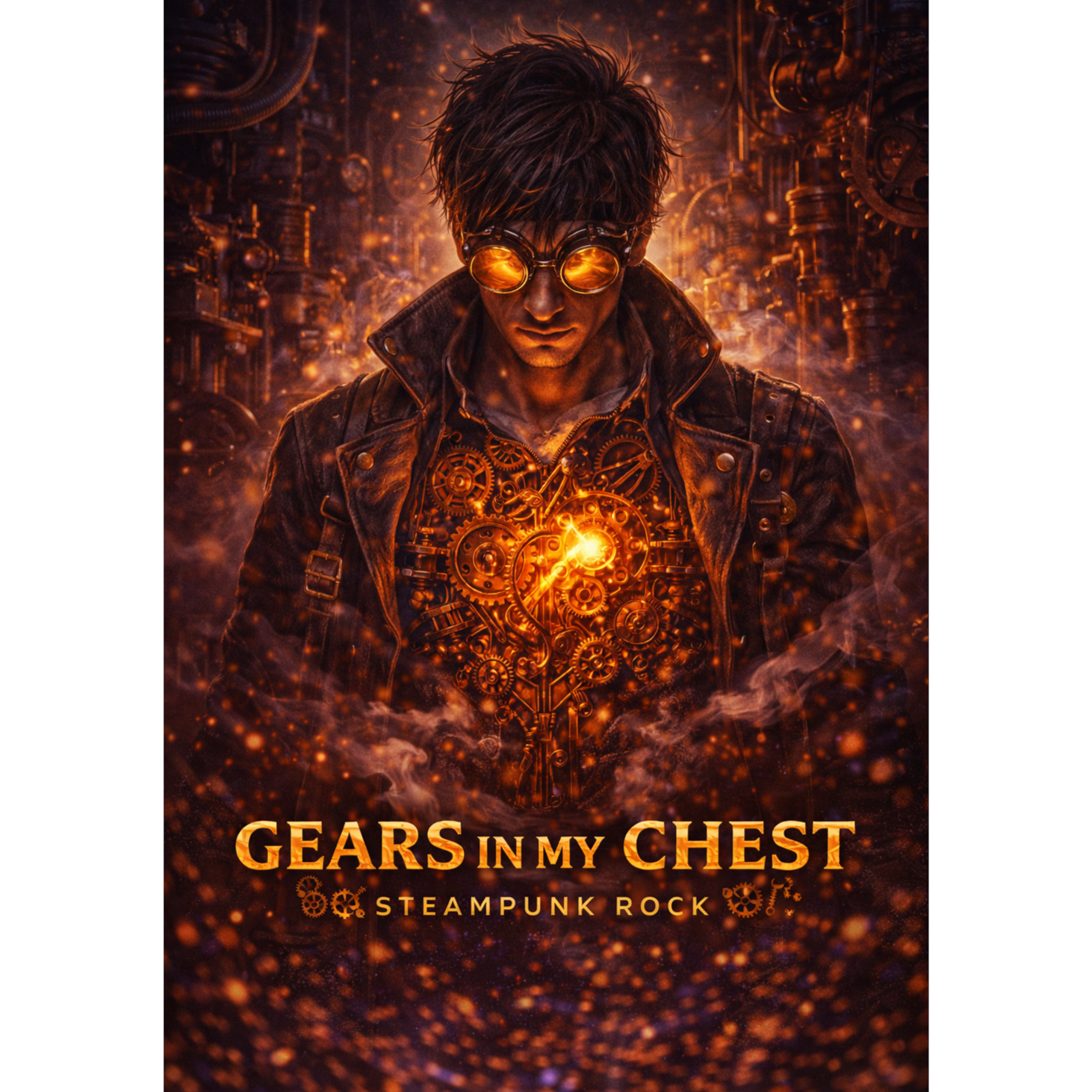 Steampunk Hard Rock with driving guitars, industrial percussion, and mechanical sound FX, Gritty vocals with occasional harmonic doubling, The rhythm section uses piston-sounding drums and steam-release transitions, Layered backing shouts and metallic clangs give the track a sense of relentless momentum
