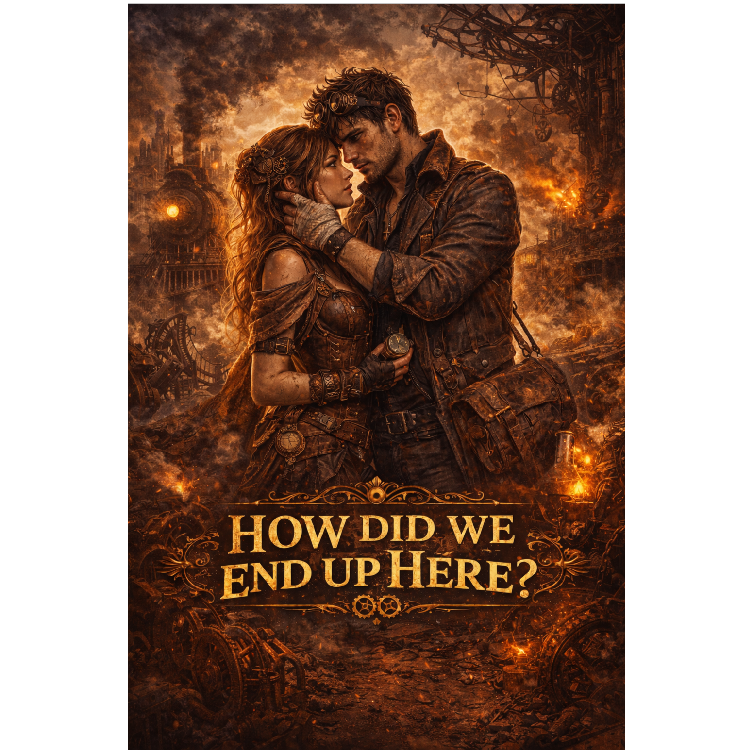 Country steampunk rock with orchestral elements, cinematic strings and brass, mechanical percussion, dusty western guitars, slow-building epic arrangement, emotional male vocals, dramatic atmosphere, post-apocalyptic romance