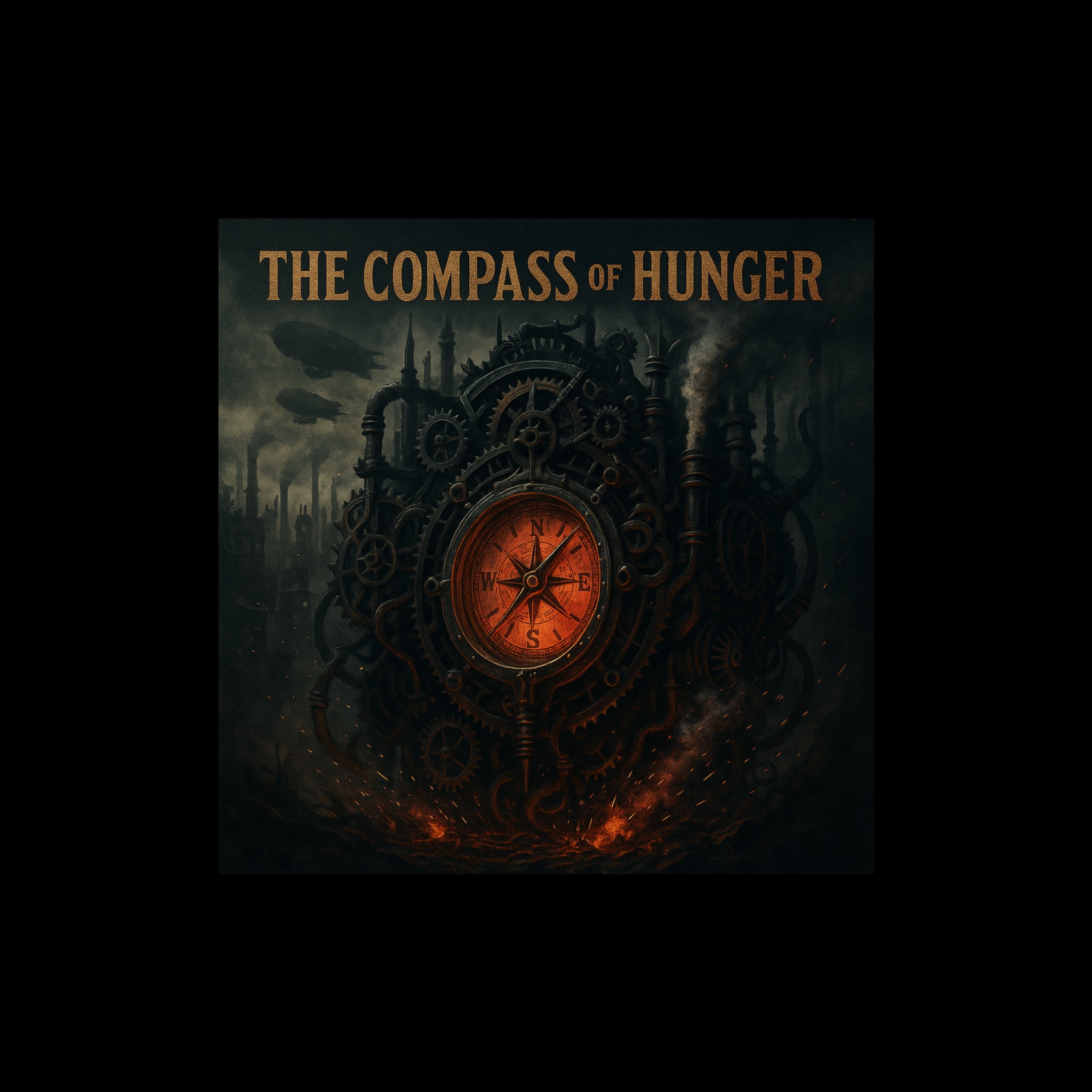 Steampunk Rock with industrial undertones, Heavy distorted guitars, mechanical percussion, deep bass, brass stabs, and cinematic build-ups, Dark, dystopian energy, blending rock drive with atmospheric orchestral elements