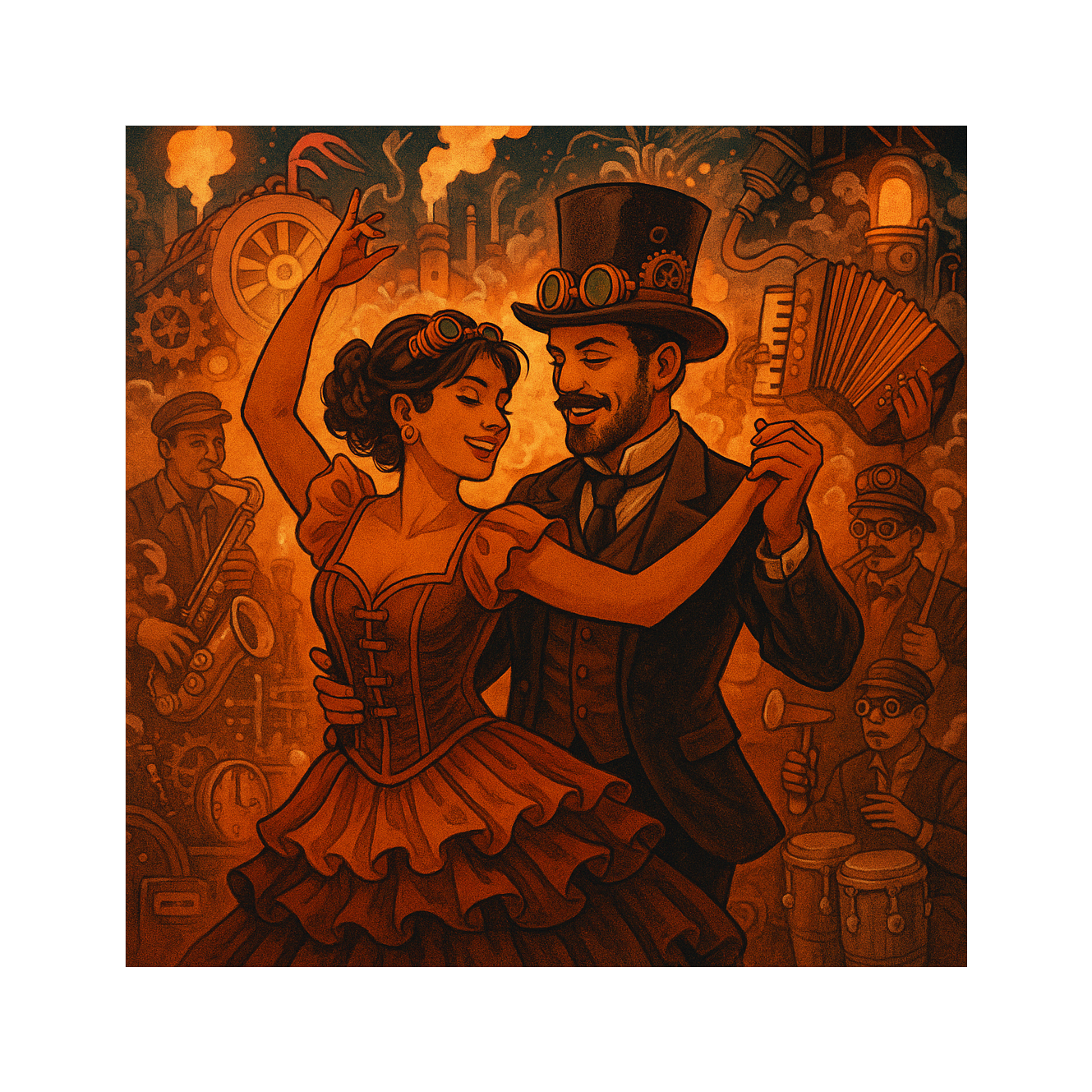 A theatrical collision of Steampunk Rock and Victorian Ballad, layered with breakneck Eurobeat momentum and sharply timed Rap verses, Orchestral strings and harpsichord set the stage, soon overtaken by distorted guitar chugs, piston-punching drums, and analog synth runs, Vocals swing between operatic waltz balladry, defiant rap, and explosive choruses backed by layered harmonies and choirs, Lyrical tone balances tragedy and revolution with flair, Think masquerade rebellion in a pressure-cooked boiler room