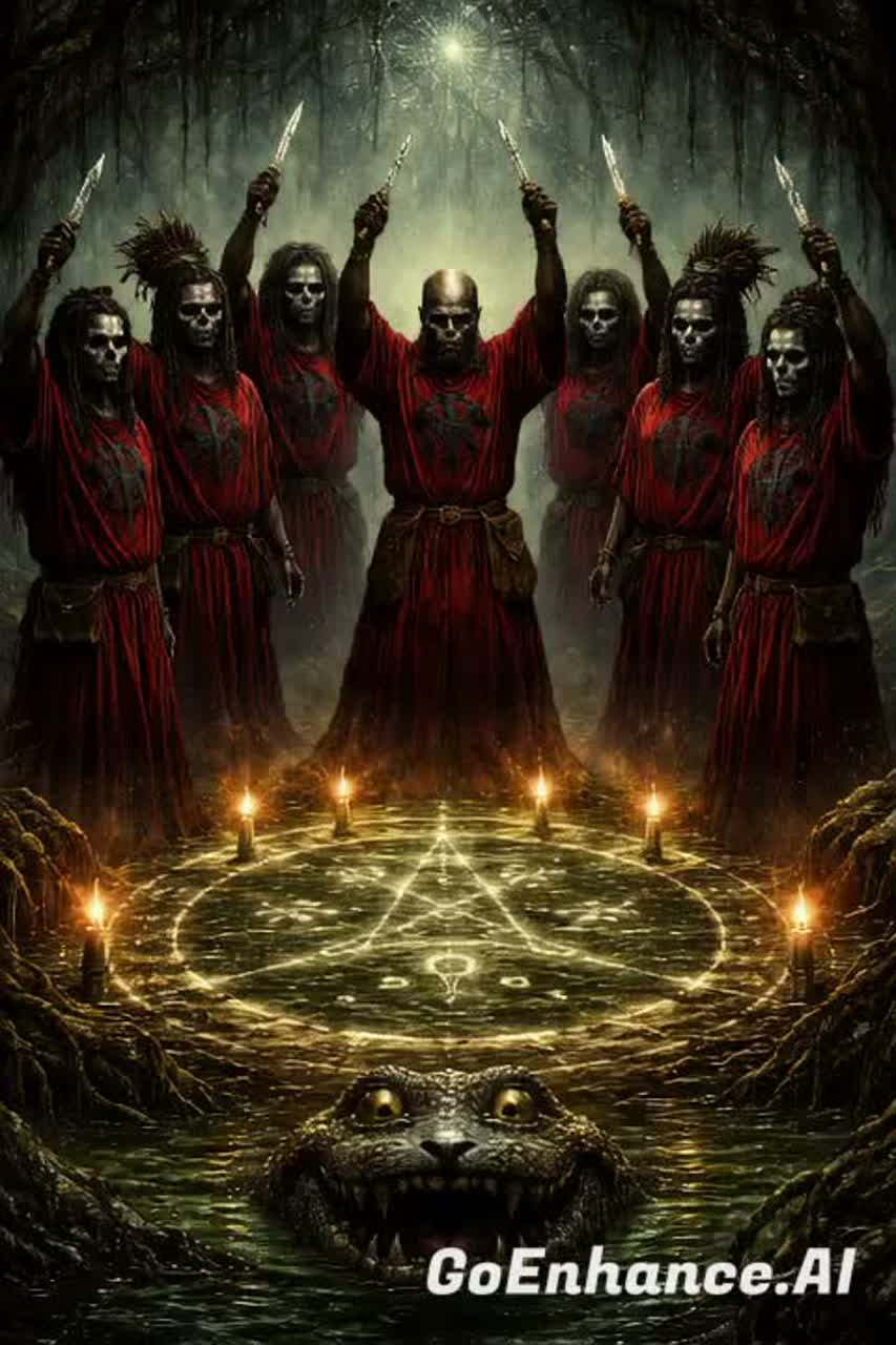 Dark Sludge Metal, Occult Atmosphere, Male vocals soaring high notes, powerful vibrato, gritty tenor, theatrical performance, Ominous Chants, Heavy Tribal Drums, Haunting Flutes, Cinematic Horror Soundscape, 80bpm, Deep South Swamp Blues, Tribal Percussion, Whispered Voodoo Chants, Heavy Distorted Bass, Cinematic Bayou Horror, Progressive Build-up, Dark Ambient, Occult
