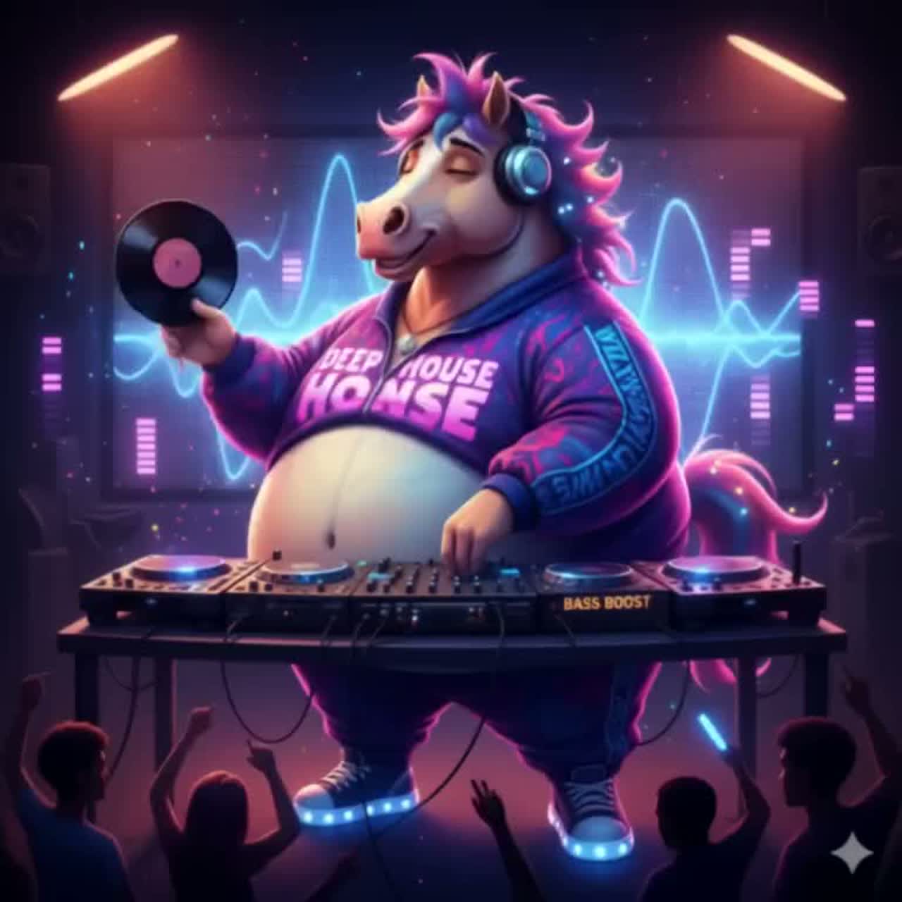 Deep house mix, G minor, 122 BPM, male vocals, playful vocal chops (“Honse!”), 303 acid bassline, Juno-106 pads, horse-call synths, galloping tom rhythm, hoofbeat percussion, stutter/delay builds, risers, sidechain compression, warm reverb, echo on bridge vocals, build: rising synth sweeps, white-noise risers, bridge: call-and-response synth/vocals, final chorus: full instrumentation, humorous yet danceable tone, epic club-ready energy crowd fx, modern electric production