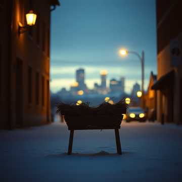 Storytelling Christmas cinematic ballad with spoken intro, piano + strings + light bells, narrative verses, soaring chorus, theme: the manger proves God steps into our mess, tempo 72 bpm, emotional bridge pointing to cross and empty tomb, gentle ending