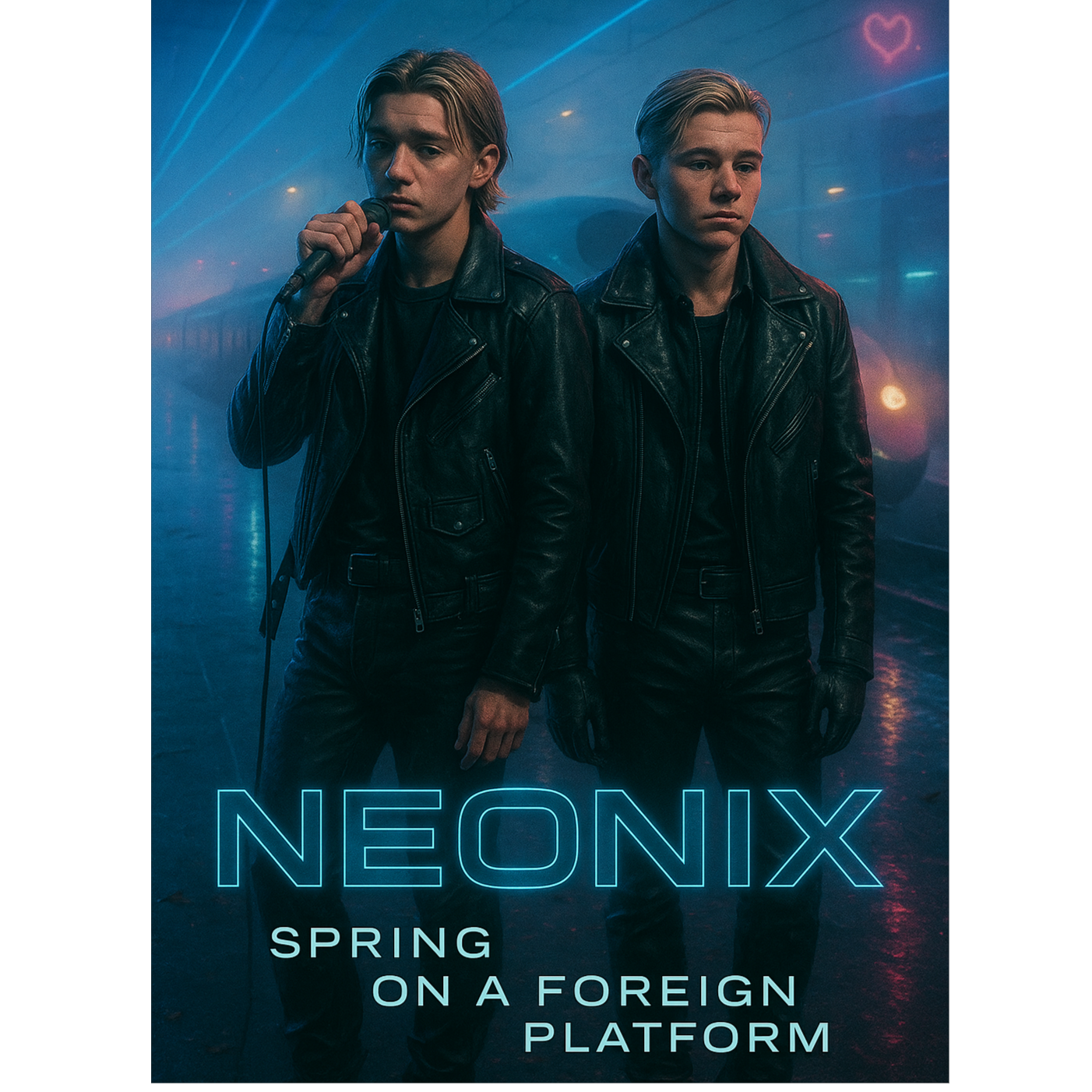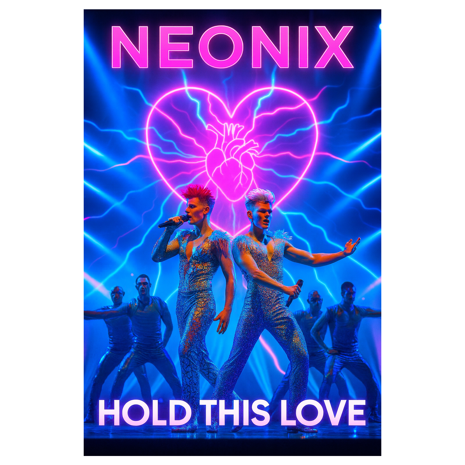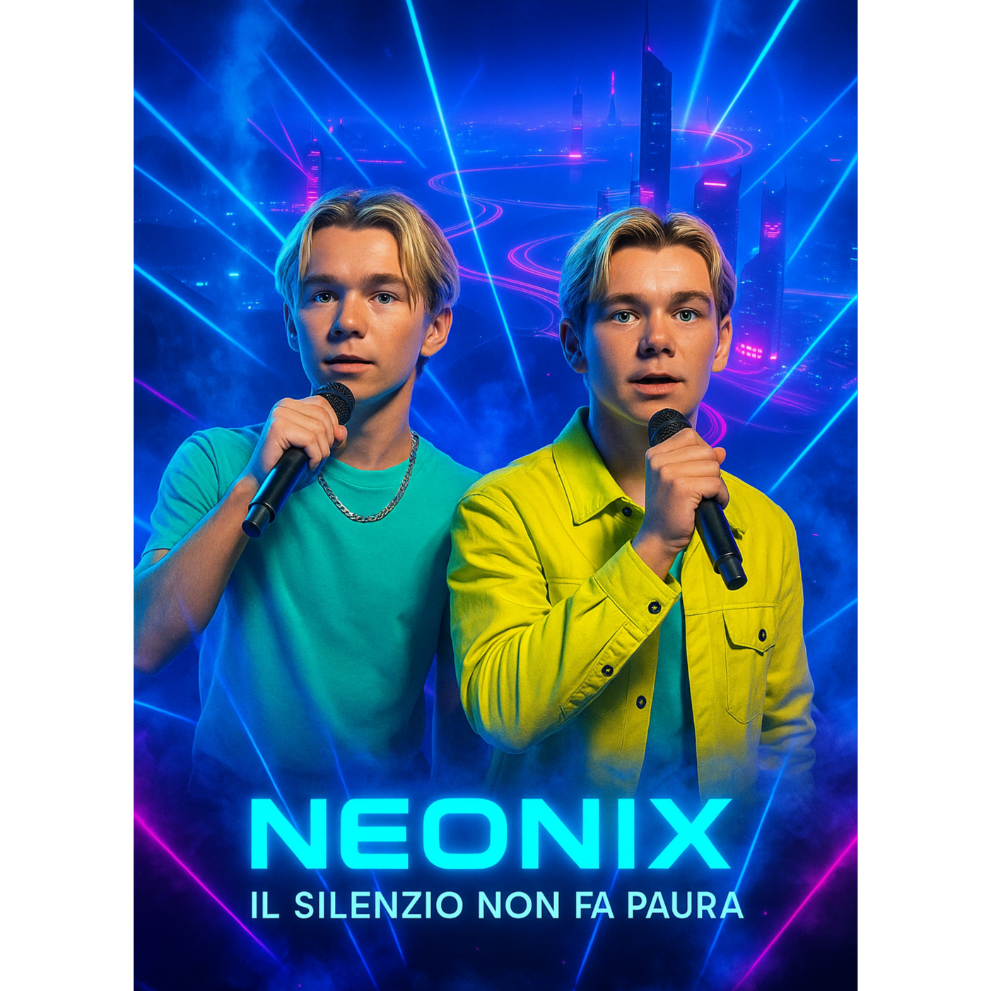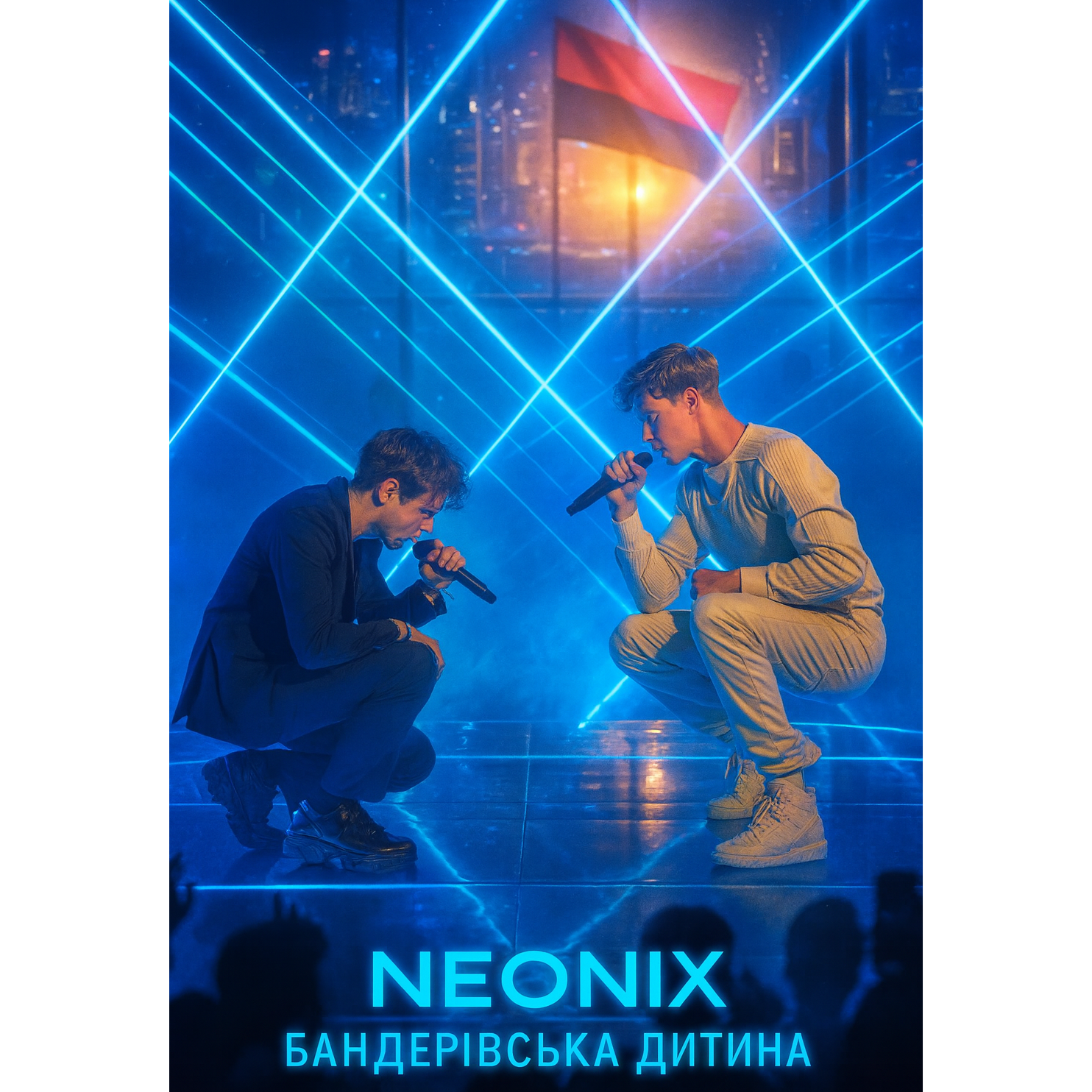 Style: Trap-Drill / club-techno-punk / UK Garage / Electro-House / EDM hybrid, Vocal: male AI duet "NEONIX" — Duet male vocals, polyphon, sweet, velvet baritone lead + airy tenor harmonies, call & response, tight doubles, Tempo/Feel: fast 140 BPM feel (Trap-Drill) with UK Garage 2-step swing; Chorus drops with club 128–130 feel, euphoric and aggressive, Instruments & FX: