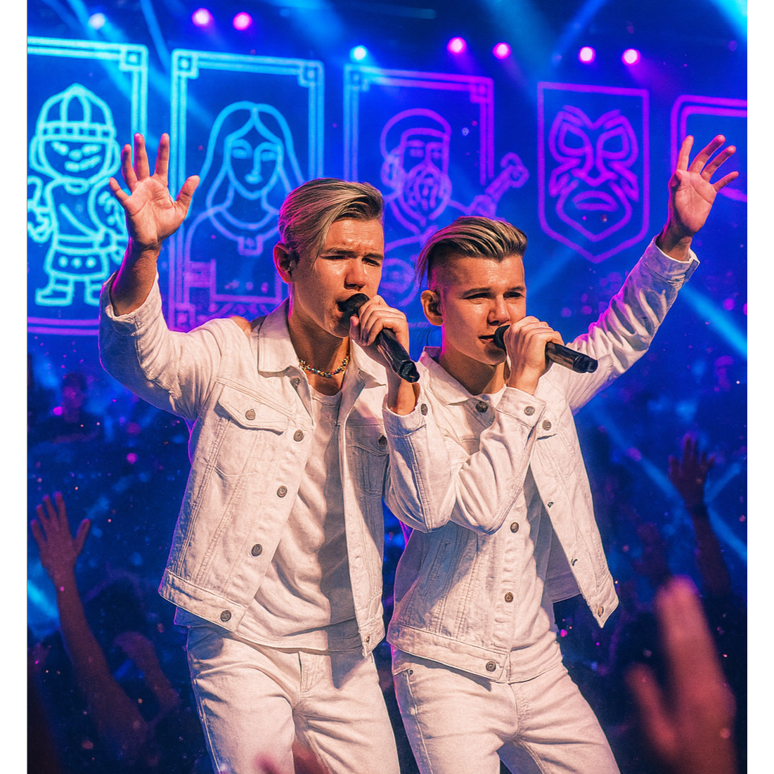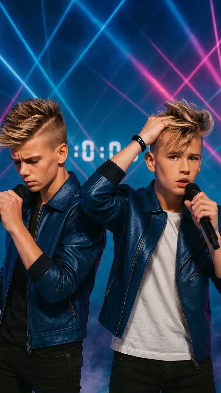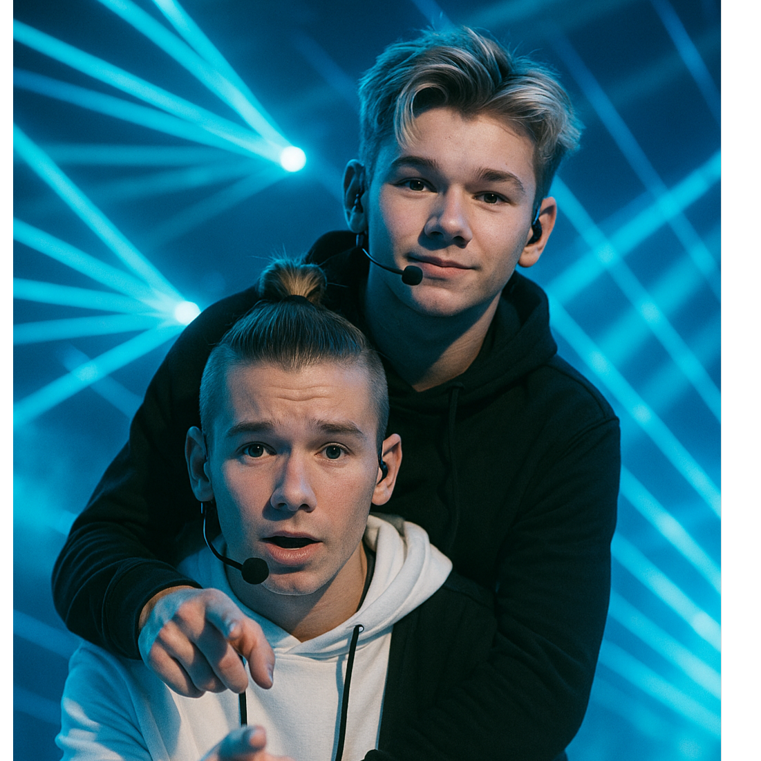 Style: Trap-Drill / club-techno-punk / UK Garage / Electro-House / EDM hybrid, Vocal: male AI duet "NEONIX" — Duet male vocals, polyphon, sweet, velvet baritone lead + airy tenor harmonies, call & response, tight doubles, Tempo/Feel: fast 140 BPM feel (Trap-Drill) with UK Garage 2-step swing; Chorus drops with club 128–130 feel, euphoric and aggressive, Instruments & FX: