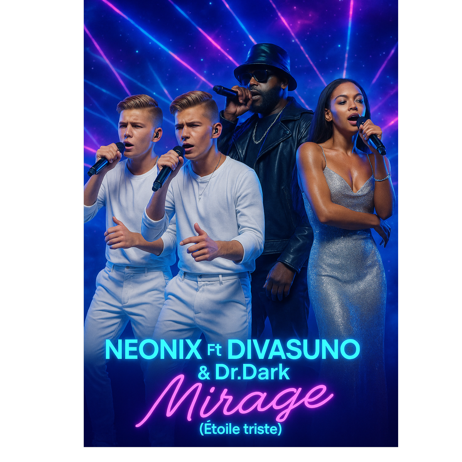 Voix A (baritone): drier, closer mic, a bit of saturation, French parlé-chanté, Voix B (tenor): wider, brighter, more reverb in the choruses, Hooks: synchronized doubles on “Mirage, mirage”, harmonies in thirds in the 2nd bar of the chorus