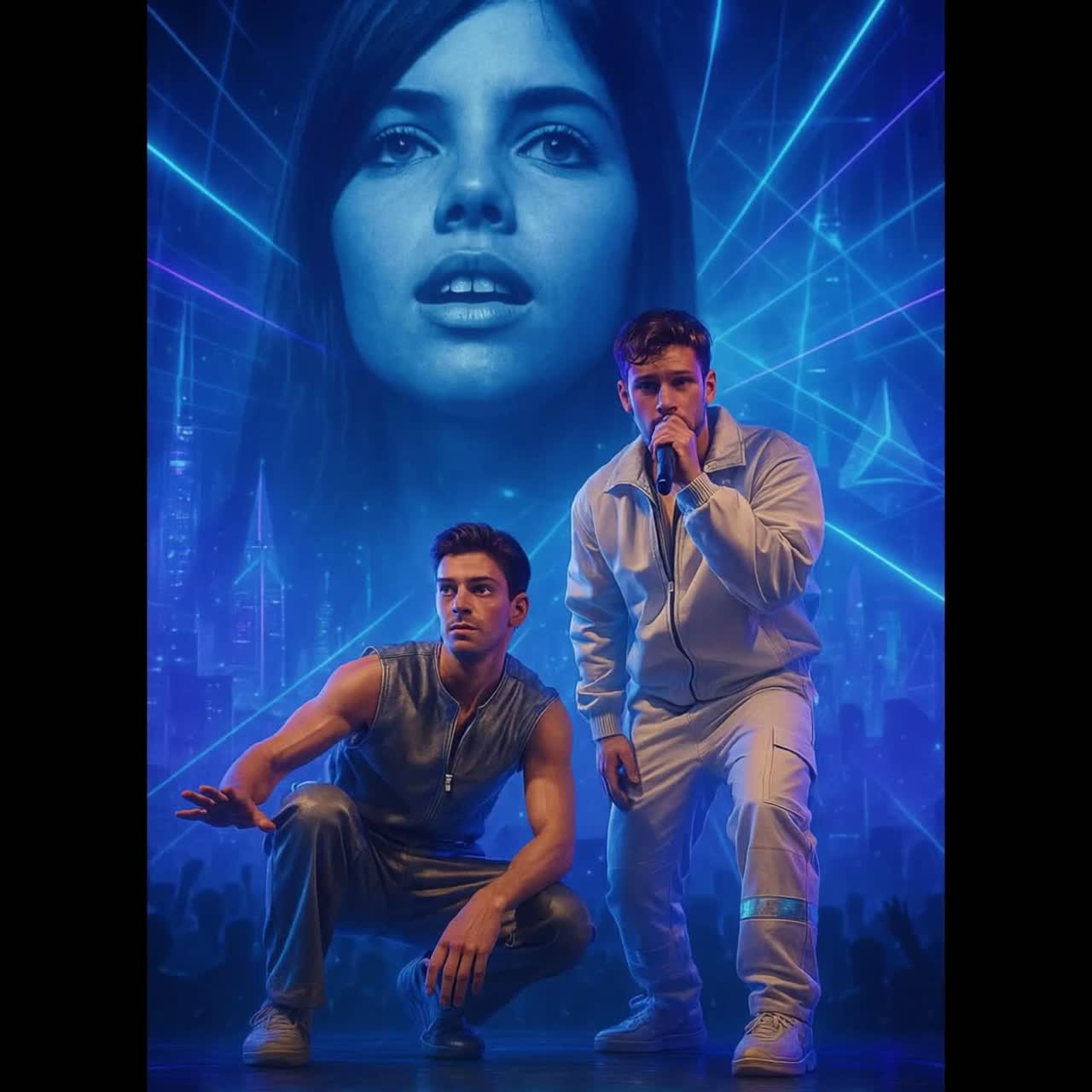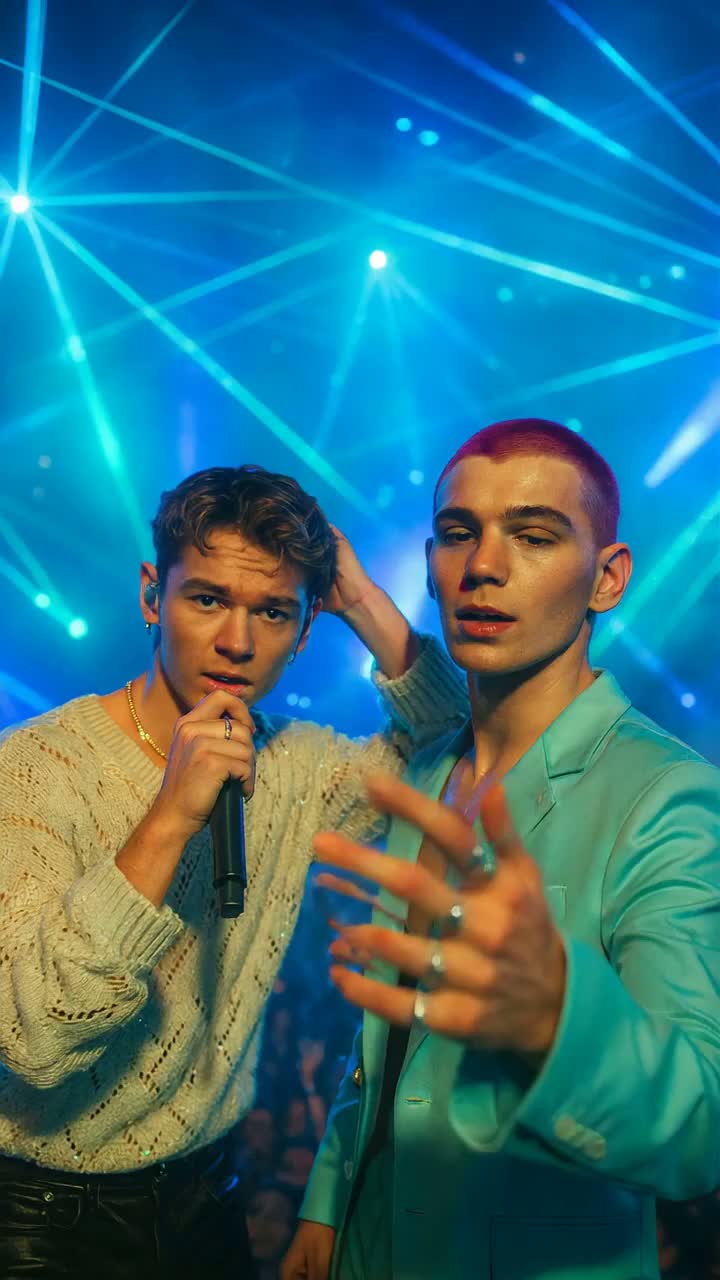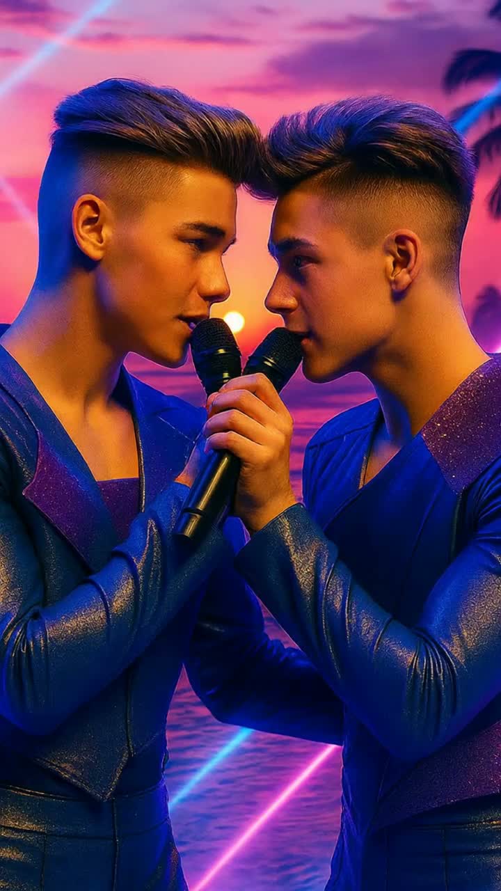 futuristic fusion (Italian Electro-Chanson × British Techno Remix × UK Garage × Tropical House) • BPM 122 • Key A minor; final chorus modulates to C major • Duet: two male vocals (Tenor A lead, Baritone B counter-melody), occasional male glissando • Groove: syncopated UKG bass, 4-on-the-floor kick with clap/snare, light shuffle hats • Instruments: airy analog pads (“pads analogiques liquides”), clean plucked pop synths, deep sidechained bass, clean electric guitar with chorus, steel drum + marimba for tropical drop • FX: oceanic reverb, tasteful delays, reverse snare swells, “laser” hi-hat flicks, light vocoder on backing stacks, stereo-panned BVs, whisper ad-libs •