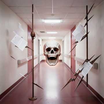 metal, Jagged alternative/experimental metal with male vocals; detuned, riff-driven guitars in odd meters, punchy, snarling bass, and surgically tight drums, Verses ride syncopated, stop‑start chugs with manic shouted vocals and micro Middle Eastern modal bends; choruses explode into wide, melodic lines over half‑time stomp, Abrupt tempo flips, theatrical spoken breaks, and dissonant stabs create whiplash contrasts, ending on a sudden unison hit that cuts to dead air, alternative metal, raw, dynamic, experimental, dynamics, vocal