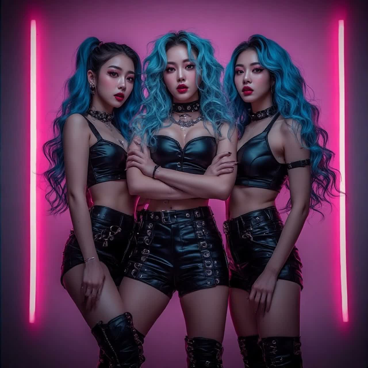 Dark techno track at 138 BPM (135–140 range), Berlin warehouse energy evolving into Ibiza rooftop festival euphoria, Female group vocals (Korean/English mix), sultry, commanding, chant-driven, Deep sub bass, heavy four-on-the-floor kick, repetitive primal drums and ritual percussion, Layered bongos, toms, snare, timbales, marimba, and classical percussion textures, Hypnotic minimal verses, trance-style tension build-ups with risers and vocal chants (“하나, 둘, 셋, 뛰어”), Explosive drops with pounding bass, stacked percussion, industrial textures, and cathartic festival release, High-energy, sweaty, tribal-techno with euphoric payoff