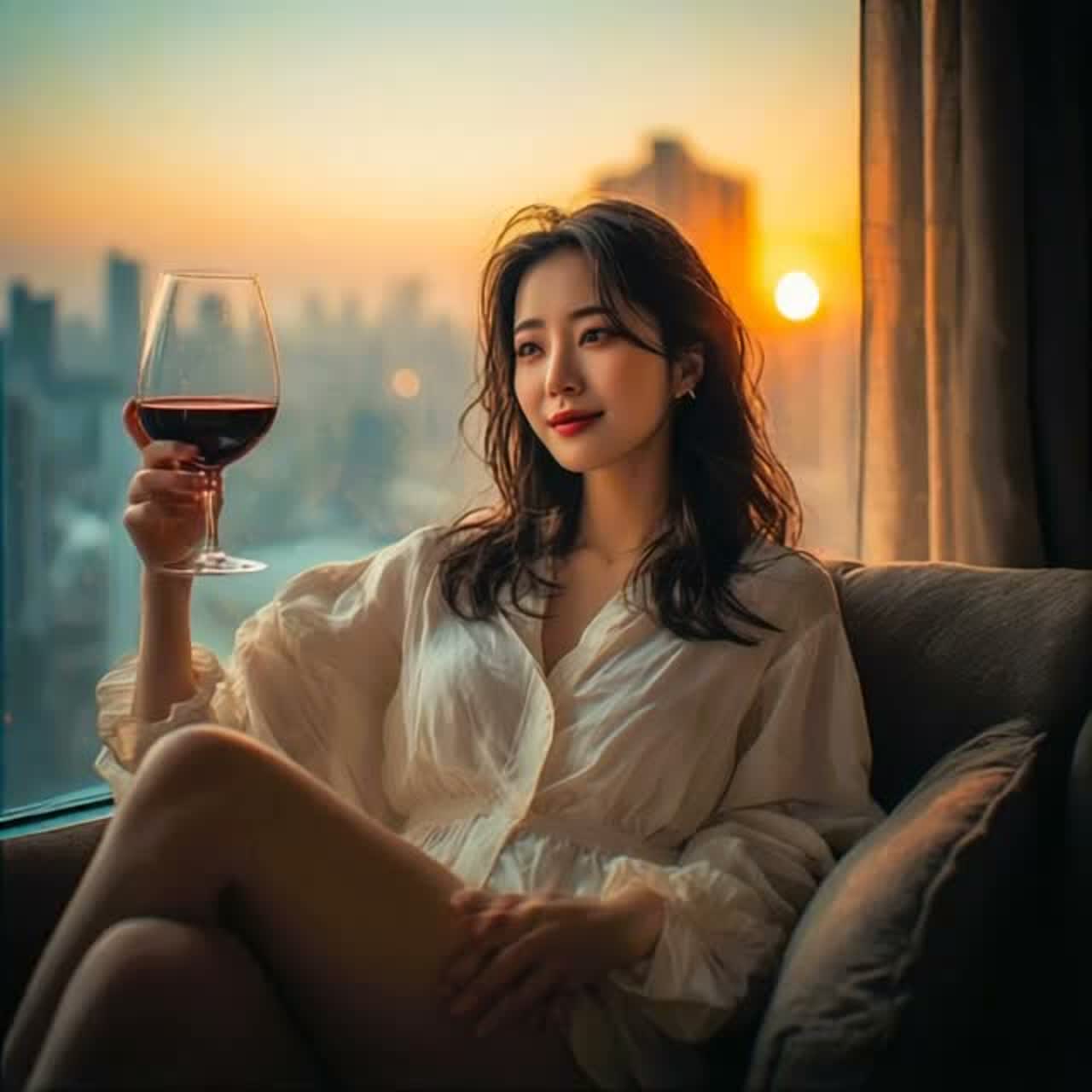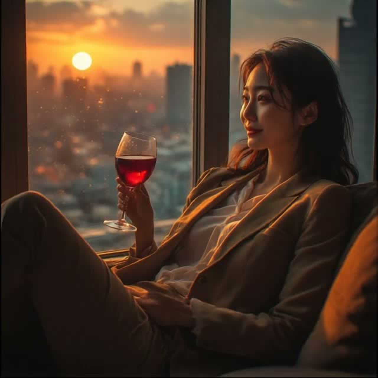 Korean lounge chill ballad, countryside calm evening atmosphere, smooth breathy airy female vocals, intimate and soft delivery, ambient serenity, gentle breeze through open window, sunset reflection glow, minimal instrumentation, warm electric piano, soft acoustic guitar, light lo-fi drums with brushed snare, subtle strings pad, spacious reverb, slow tempo (70–85 BPM), emotional but peaceful, self-care me-time mood, cozy couch listening vibe, cinematic yet minimal, ASMR-like vocal texture, tender and soothing tone