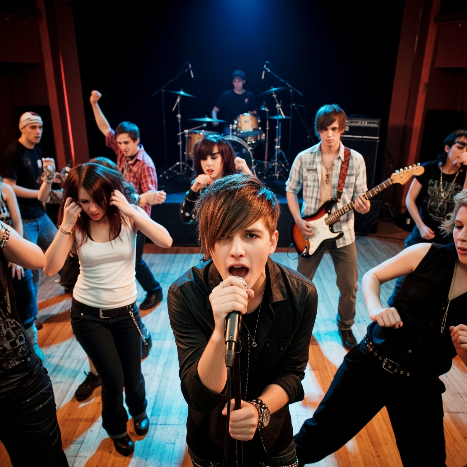 2000s Dance-Pop, Electropop, Teen Pop, New Rave, 2000s, 2000s Alternative Dance, Indie Rock, very fast, teen male emo vocal, party, sexual, melodic, energetic, warm fuzzy synth, low-frequency synth, warm spacey pads, layered sustained synth brass, punchy kicks, claps, happy, nocturnal, repetitive, warm, uplifting, high-pitched synth arpeggios, 2000s Pop Punk, Power Pop influences, Punk Rock fast-paced tempo, distorted electric guitar riffs, loud power chords, crisp harmonies, angular guitar, Dance-Punk groove, rhythmic, sensual, passionate, Indietronica influences, ‑Slow, ‑female vocal