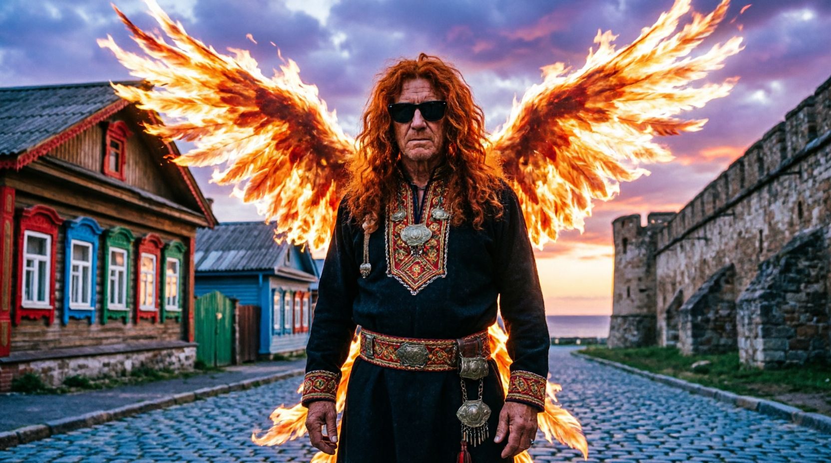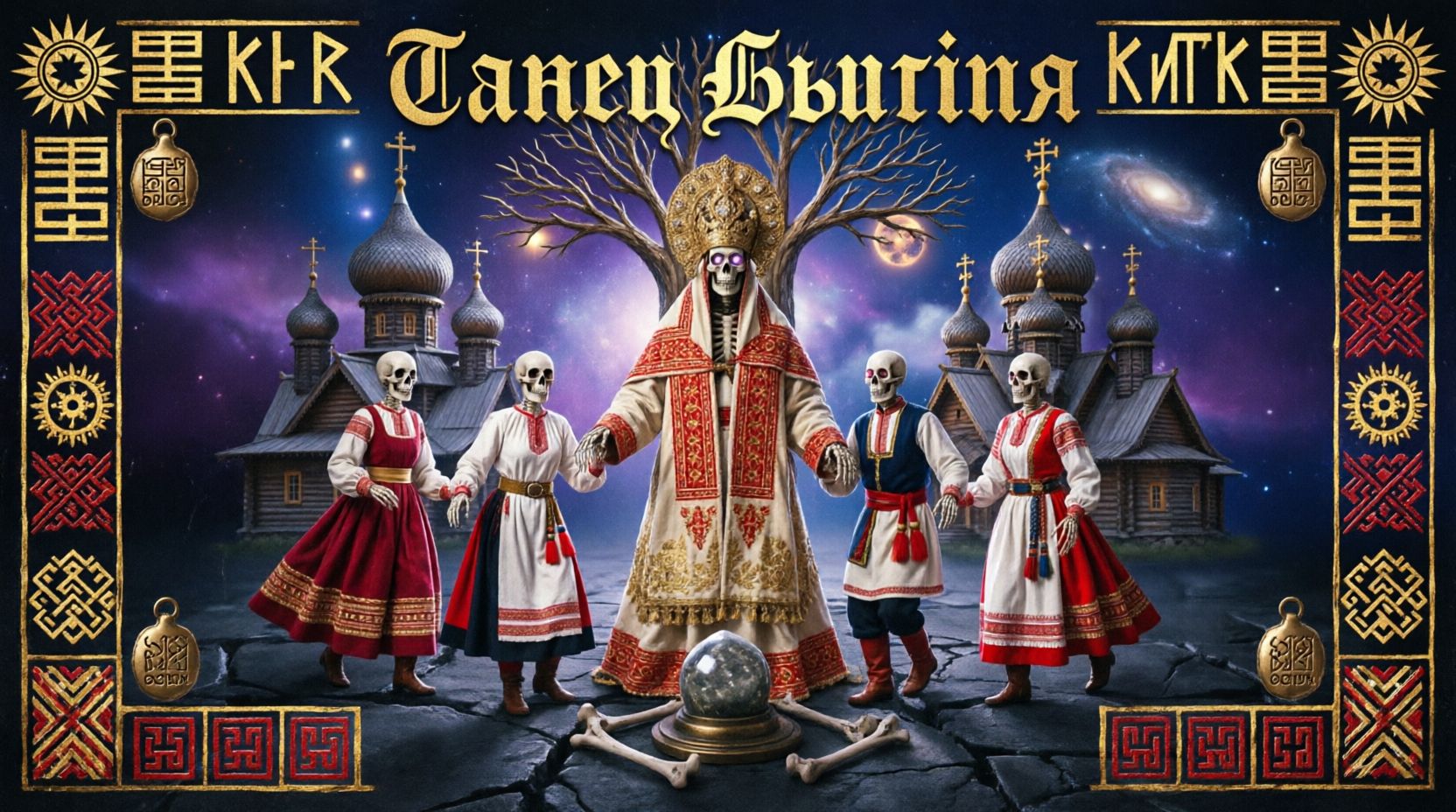 A high-energy fusion of Slavic folk and industrial metal, characterized by aggressive percussion and traditional instrumentation, The track features a driving 4/4 beat at 130 BPM, utilizing a combination of heavy distorted electric guitars, a deep synth bass, and a prominent hurdy-gurdy or bagpipe-like lead melody, The vocal performance consists of powerful, operatic female vocals and guttural, rhythmic male chanting in Russian, The structure includes a cinematic intro with heavy drum hits, followed by high-intensity verses and a soaring, melodic chorus, Production is polished with a wide stereo field, heavy compression on the drums, and a touch of reverb on the vocals to create an epic, atmospheric feel, The chord progression alternates between a dark minor tonic and dramatic shifts to the subdominant and dominant, emphasizing a folk-metal aesthetic