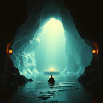 Slow hypnotic chillout at 65 BPM, male vocals as mantra-like murmurs and low chants, framed by deep drones, frame drums, and airy Eastern plucked strings, Percussion stays steady and earthy, shakers and low toms in a strict, leveled pattern, Reverbs stretch the vocal into a cavernous space; occasional overtone-style backing hums rise and fall like distant monks, creating a gently trancelike arc that glows then fades