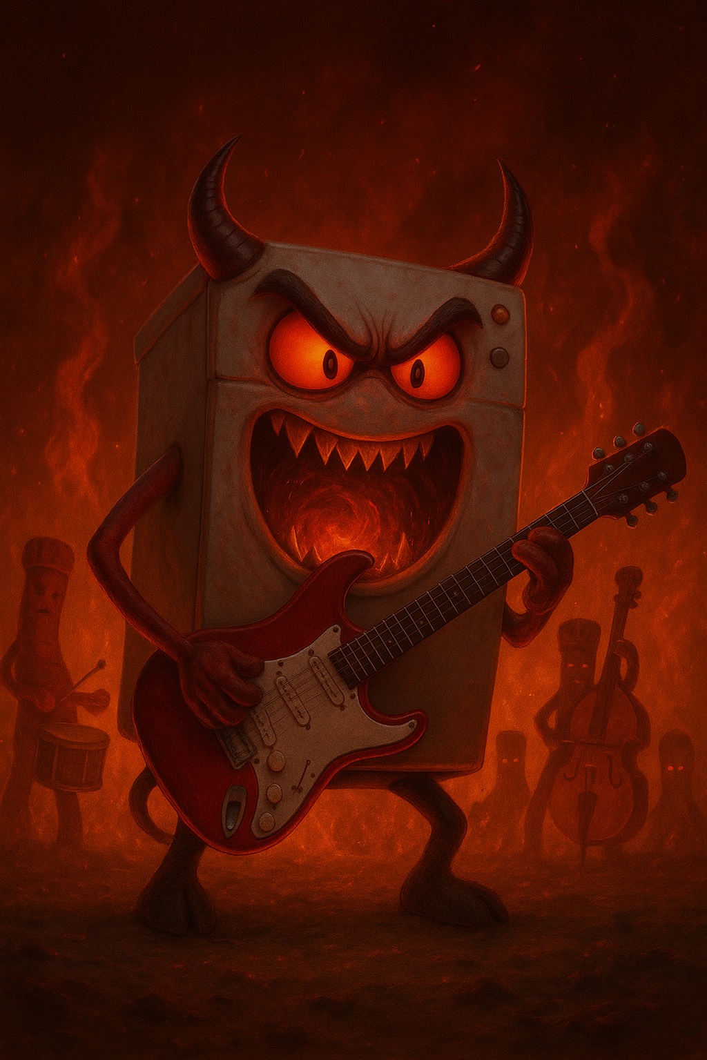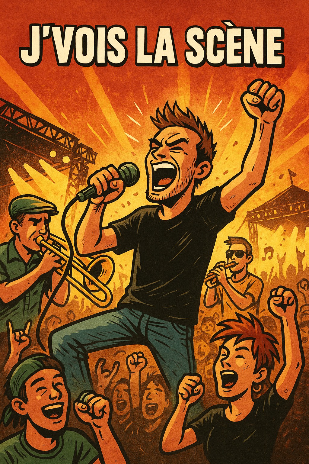 – Voice 1: raw, aggressive, raspy, militant delivery, – Voice 2: sharp, precise, street-poetic flow, – Voice 3: deep, dark spoken-word storyteller with threatening punchlines, – Voice 4: mocking female MC, proud attitude, sarcastic bite, Live crowd energy with shouts, laughs, chants, call-and-response, claps, Breaks with humorous interludes, sudden beat drops, Big crescendo finale with the crowd chanting the hook in unison