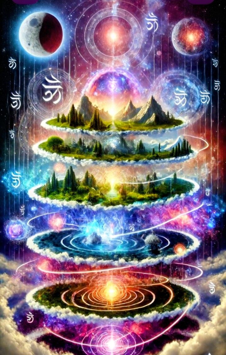 Ceremonial tribal–cosmic soundscape built as a layered recursive simulation, Tempo 72 BPM, slow tidal heartbeat, Key: D minor/D Dorian, tuned to A=432 Hz, Drums: deep frame drums, taiko, djembe, toms, Play in recursive polyrhythms, repeating in cycles that shift at half/double lengths like fractals, Voices: male throat singing (low grounding), ethereal crystalline vocals (angelic soaring), whispered breaths (textural layers), Instruments: crystal bowls (D–A–G tones), tanpura-like drone, sub-bass tide, water chimes, plasma-like synth pads, Effects: recursive delays, ping-pong echoes, reverse swells, spiral glissandos, Reverb long and spacious, creating nested chambers, Use spiral panning for chimes/whispers, Chanted tones (elongated, recursive):