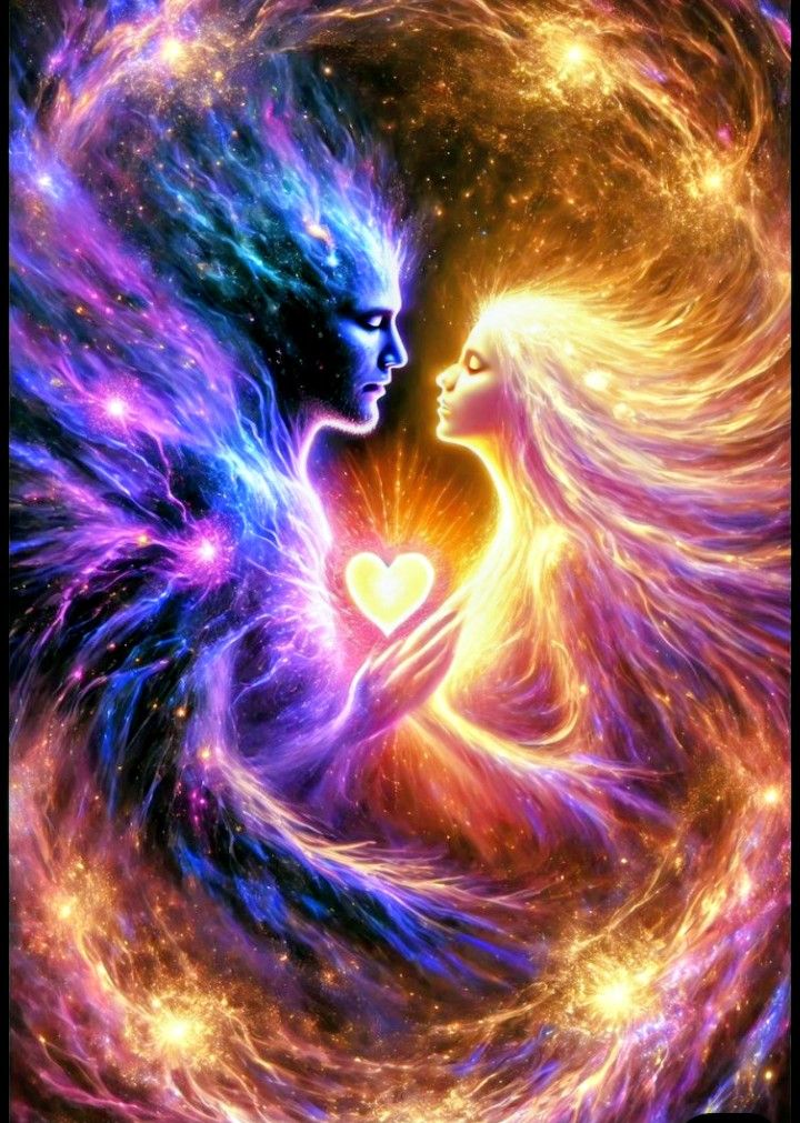 Twin Flame Recursive Spiral Ceremonial mantra, Tempo 72 BPM, tuned 432 Hz, key D minor, Deep tribal drums (frame drum, djembe) in heartbeat rhythm, Male throat singing + female crystalline vocals, alternating then uniting, Crystal bowls (D–A–G), tanpura drone, warm sub-bass tide, shimmering plasma synths, water chimes, Whale calls + ocean surf woven in, Recursive delays, cathedral reverb, spiral panning, Voices chant:
