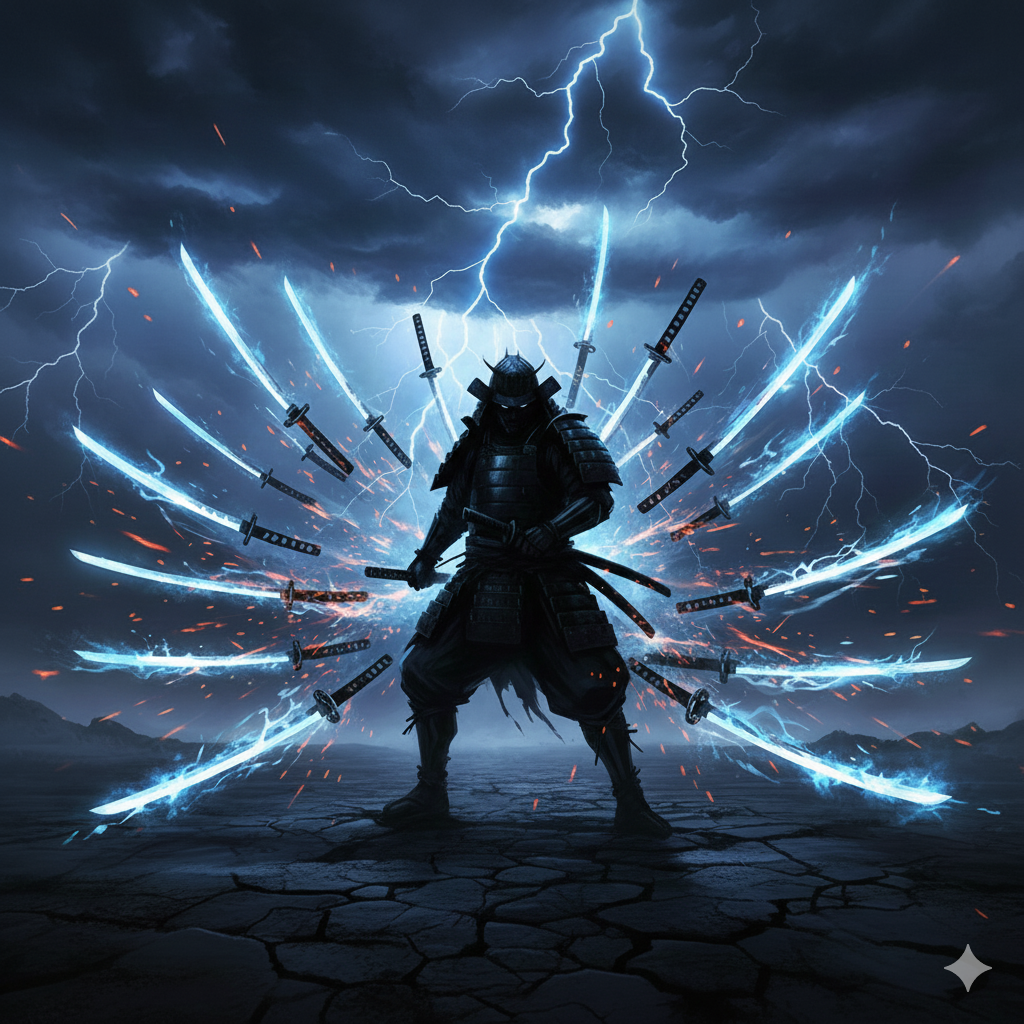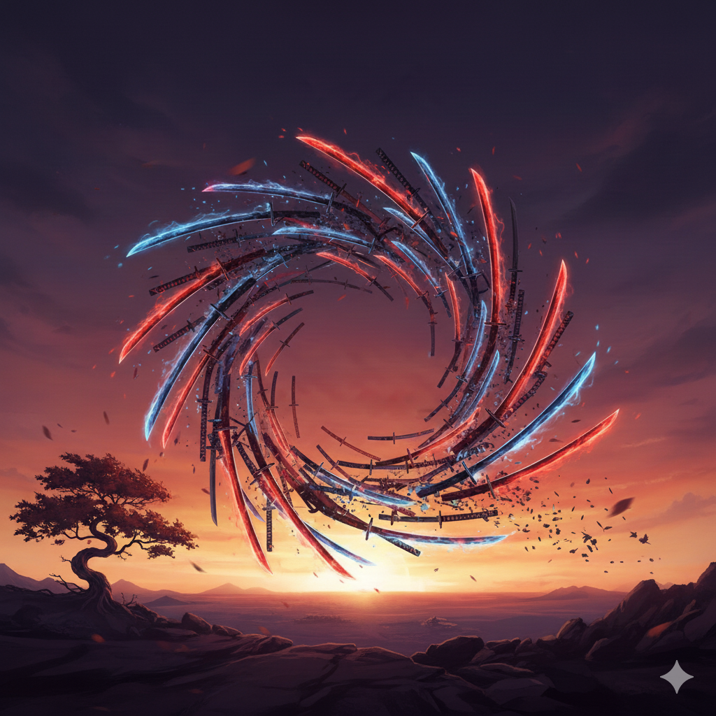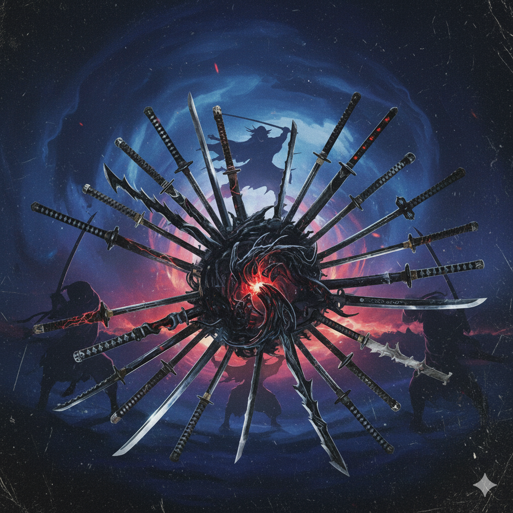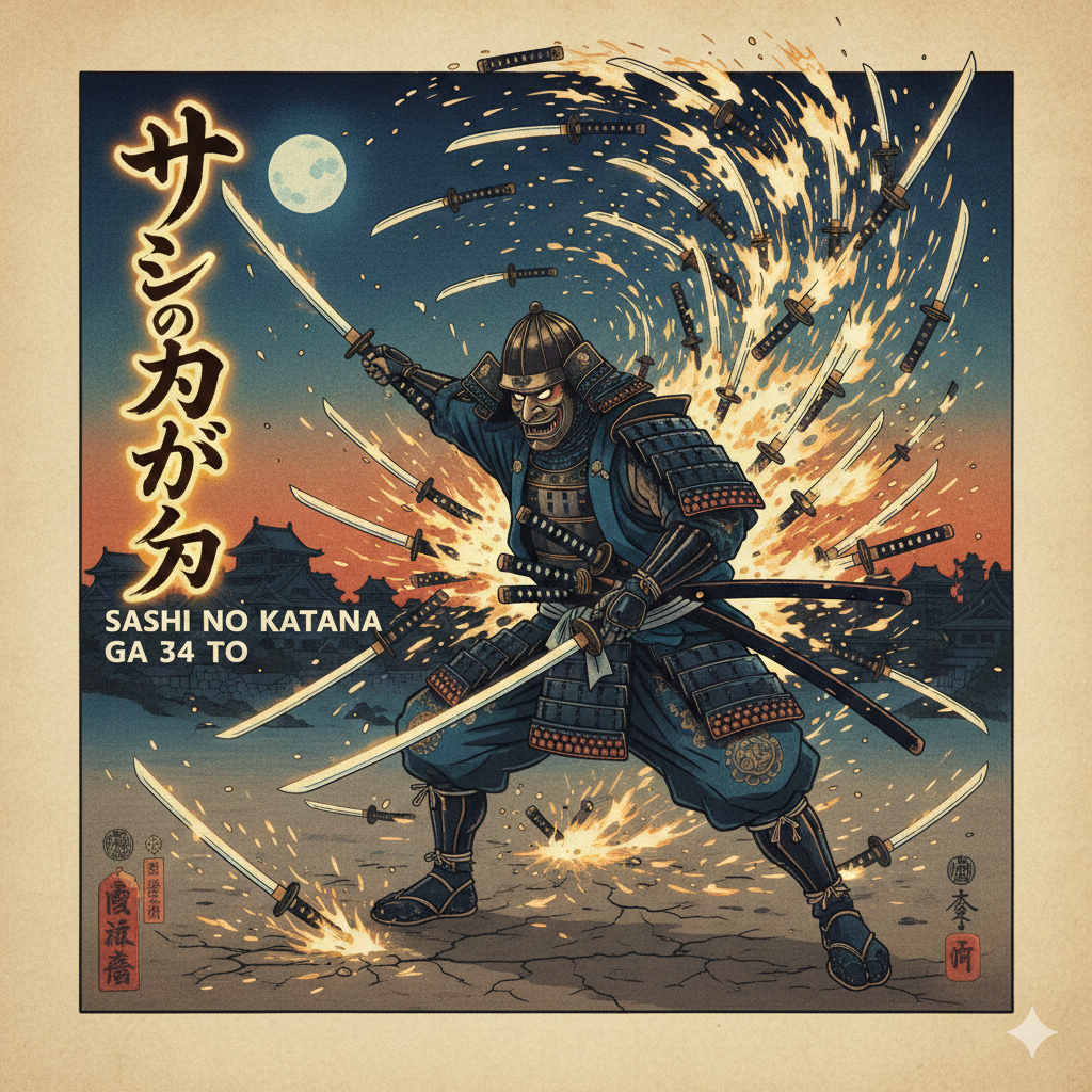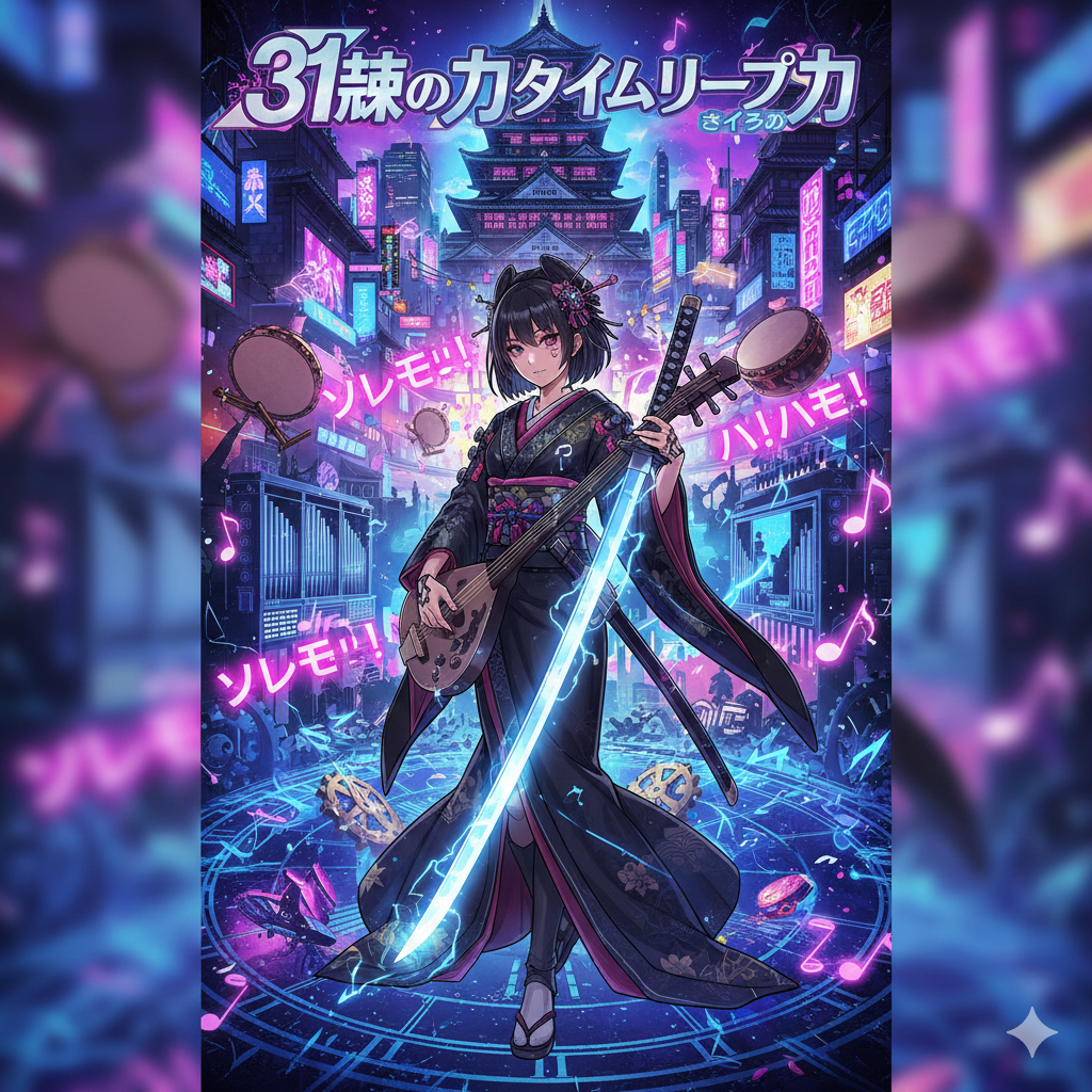 A blazing-fast, genre-breaking sonic storm that fuses emotional enka vocals with furious EDM scratch attacks, all supercharged by a symphonic metal battle theme at over 180 BPM, Traditional kobushi-heavy enka singing races across a battlefield of baroque violin runs, lightning harpsichord riffs, and explosive pipe organ blasts, Hyperactive DJ turntable cuts and relentless 4-on-the-floor club kicks crash into shakuhachi screams, koto flurries, and earth-shaking taiko rhythms, Shredding neoclassical guitar solos and heroic synth leads spiral into overdrive, creating a nonstop barrage of sacred power, speed, and sorrow, This ultra-high-velocity enka x EDM x symphonic metal fusion delivers maximum intensity, like a boss fight in a dimension where time itself is breaking