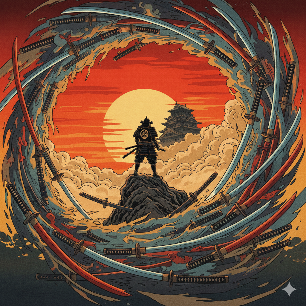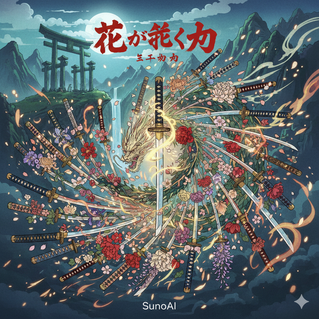 A fast-paced, emotionally charged kayōkyoku ballad fused with the energy of classic fantasy RPG soundtracks, Based on a minor or pentatonic scale, it flows in lively 6/8 or quick waltz time, driven by dynamic rhythms and dramatic shifts, Instrumentation blends traditional Japanese elements—shakuhachi, koto, shamisen, and taiko—with vibrant strings, brass accents, timpani, retro electric guitar with sharp vibrato, and bright analog synths, Accordion, organ, and touches of harp or celesta add a sense of motion and adventure, Vocals (E3–F5) are intense and expressive, featuring enka-style kobushi and kayōkyoku phrasing to express themes of fate, struggle, and longing, The melody follows a pentatonic base with quick modulations and brisk phrasing to match the tempo, Production emphasizes analog warmth, tight compression, and vintage stereo depth, Spatial effects such as echoing shrines, distant drums, and wind chimes in motion create a world where nostalgia meets urgency in a vibrant, cinematic soundscape