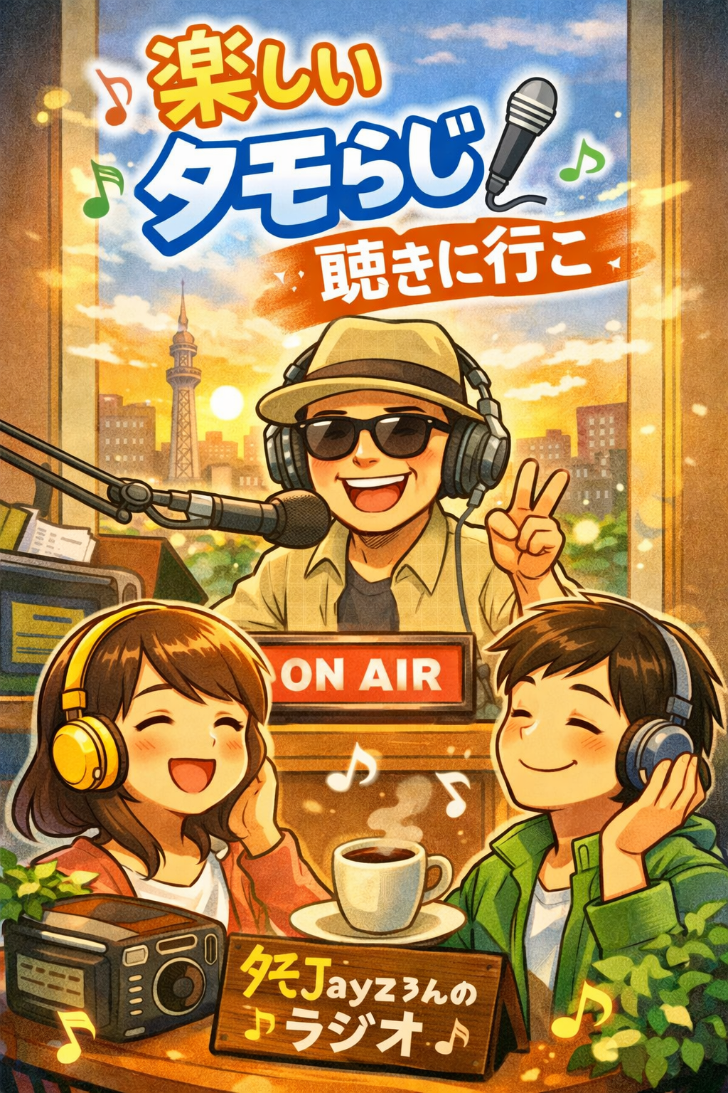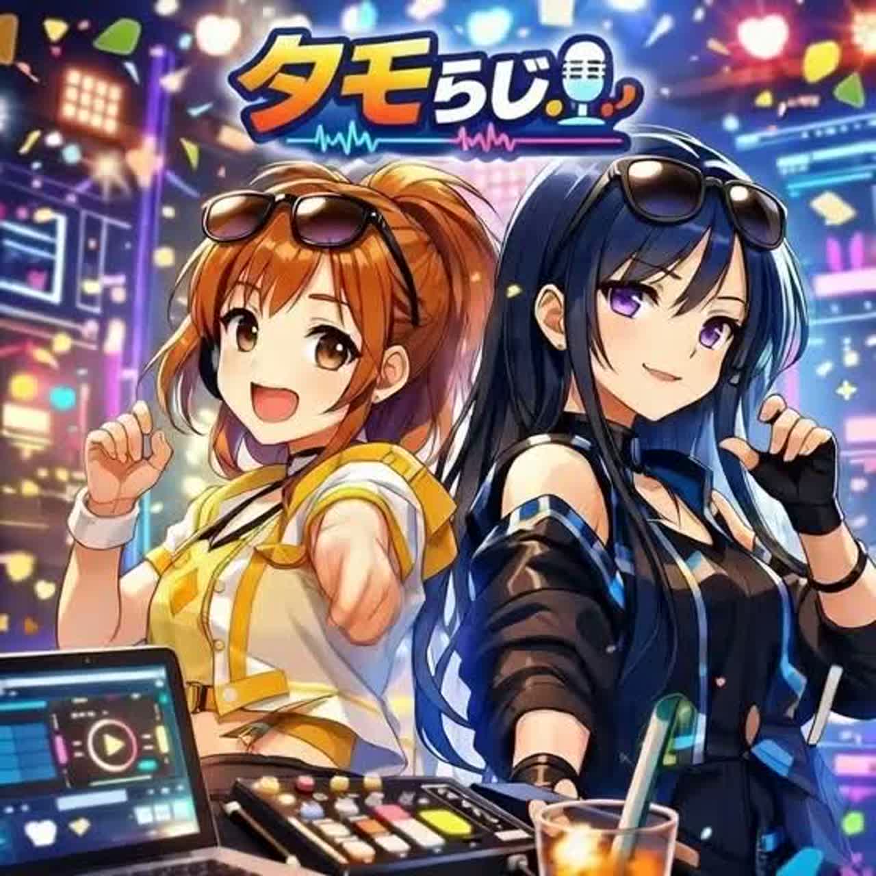 Bright, energetic anime opening theme for a livestream music show called “タモらじ, ” performed by a two-girl unit with clear contrast (one cheerful and sparkling, one cool and smooth), fast tempo around 160 BPM in a major key, vivid and catchy J-Pop/Anison style with a short TV-size structure, opening with a shimmering synth arpeggio and digital notification sounds that feel like a stream starting, followed by punchy electronic drums, bright pop bass, glossy rhythm guitars, colorful synth leads, and occasional chip-tune accents to evoke chat and online energy, verses light and bouncy with playful vocal trade-offs and tight harmonies, pre-chorus rising with filtered pads and snare build to create anticipation, chorus exploding into a huge, uplifting hook with layered vocals and sparkling top notes expressing connection through music and community, include lyrical mood and cues such as “listening to songs everyone created, ” “this track is amazing, ” and the exciting moment of instantly recogn