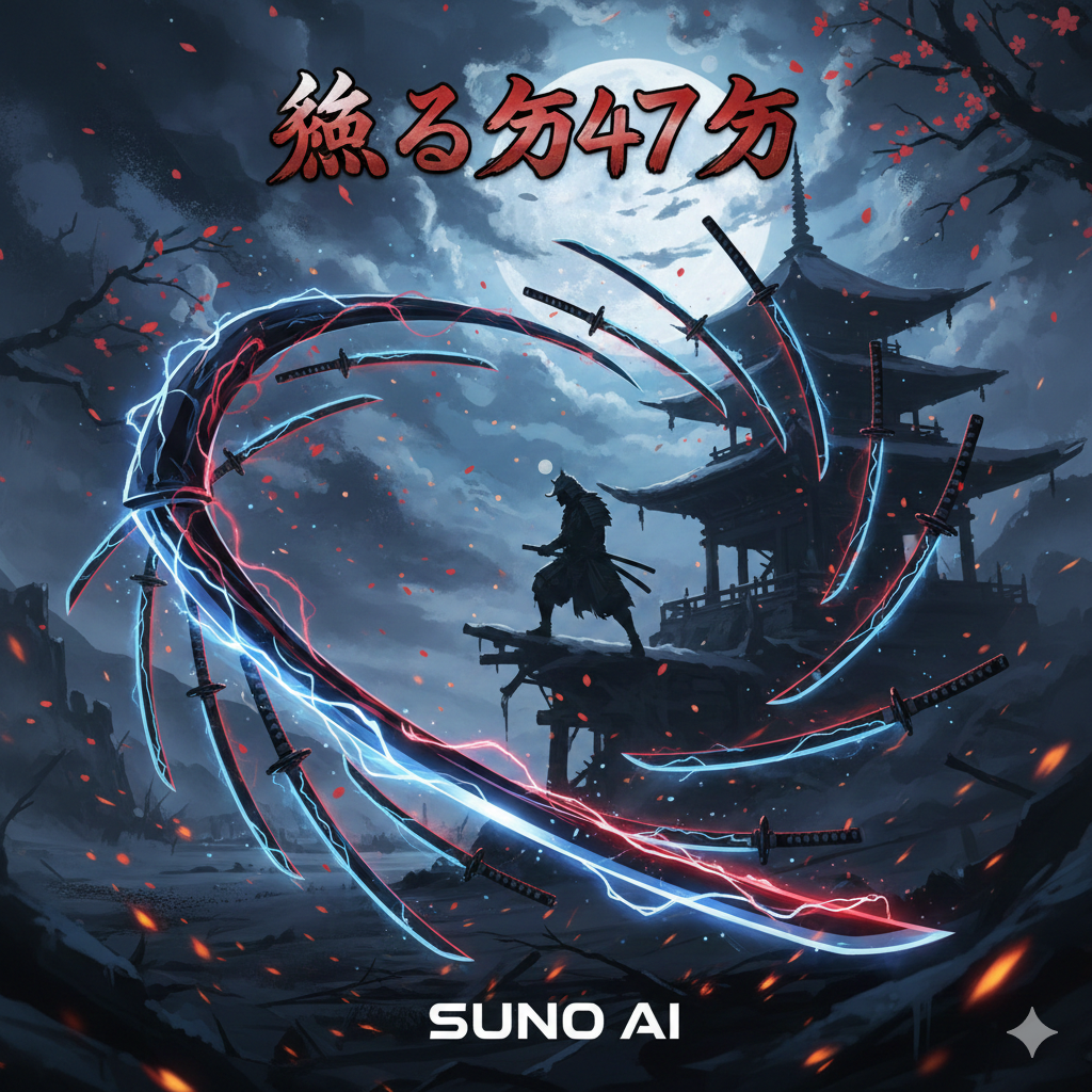[Polished mastering, wide dynamic range], dramatic Japanese cyber-enka fused with dark symphonic progressive rock, overflowing with emotional enka phrasing, passionate vibrato, and heartfelt melodic lines, opening with sorrowful shakuhachi-like synth leads, metallic koto plucks, church pipe organ drones, and slow-burning piano arpeggios, rising into intense polymetric rhythms driven by deep resonant taiko drums, shamisen-inspired guitar accents, and powerful electronic pulses, featuring expressive enka-style Japanese vocals with heavy kobushi, long sustained cries, and dramatic lyrical bends, accompanied by theatrical strings, baroque counterpoint, and cybernetic choir chants, shifting between mournful quiet sections drenched in reverb and explosive climaxes with full orchestra and roaring taiko, incorporating sudden tempo surges, emotional key modulations, sweeping string runs, and virtuosic keyboard flourishes, 148 BPM with heroic, soulful, and tear-filled energy rooted in traditional enka spirit