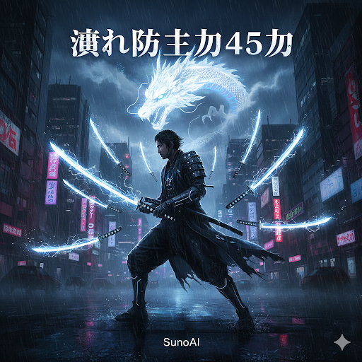 [High fidelity mastering, wide dynamic range], cyber-enka with dramatic and majestic atmosphere, cinematic introduction of shamisen arpeggios, deep taiko-like percussion, and dark synth pads blended with church organ-like synths, gradually building into polymetric rhythms with pounding 4-on-the-floor kick, sharp snare accents, and glitchy electronic fills, layered with powerful enka-style Japanese vocals filled with kobushi vibrato, shakuri, tame, and dramatic phrasing, infused with subtle vocoder harmonies and reverb-heavy backing chants, dynamic arrangement shifting between furious high-speed irregular beats, serene interludes with solo shamisen and airy synth textures, and explosive climaxes with full cyber-orchestral synth ensemble and enka choir, featuring sudden tempo changes, dramatic key modulations, fast shamisen runs, and piercing lead synth solos, blending futuristic electronic energy with traditional enka singing techniques, 145 BPM steady yet expressive pulse with epic boss battle atmosphere