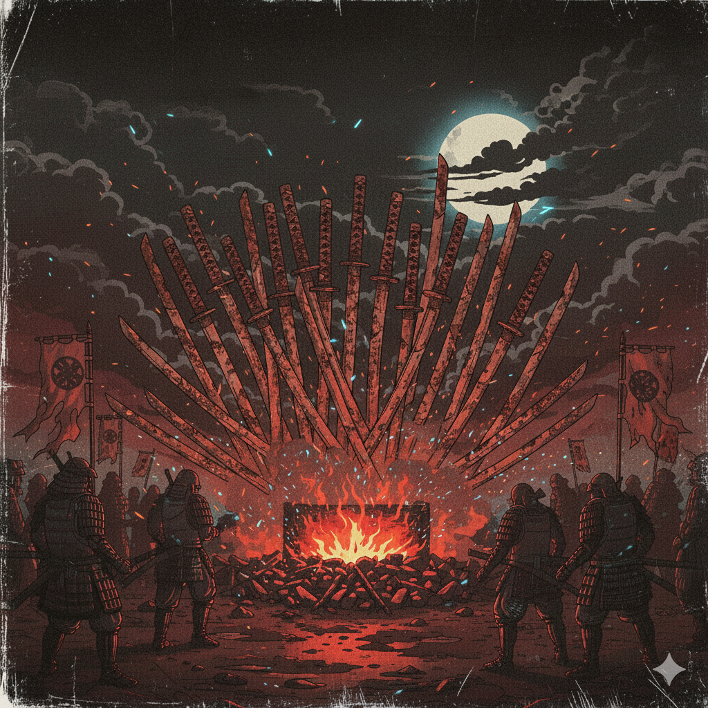 Symphonic metal × baroque × traditional Japanese instruments (taiko, shakuhachi, koto), Operatic male vocals (A2–B4), noh-style phrasing, Complex time signatures, dramatic modulations, Add eerie, distorted, mechanical textures: dissonant, chaotic, hollow, angry, pitchy, off-key, noisy, Dark divine battle at a broken celebration, HD studio sound with temple reverb and glitch FX, Japanese lyrics