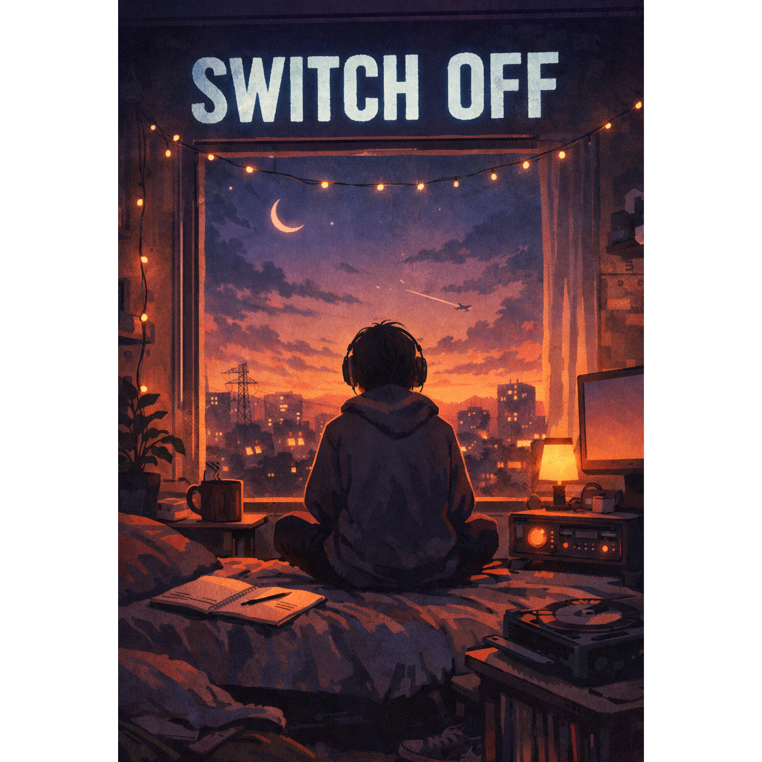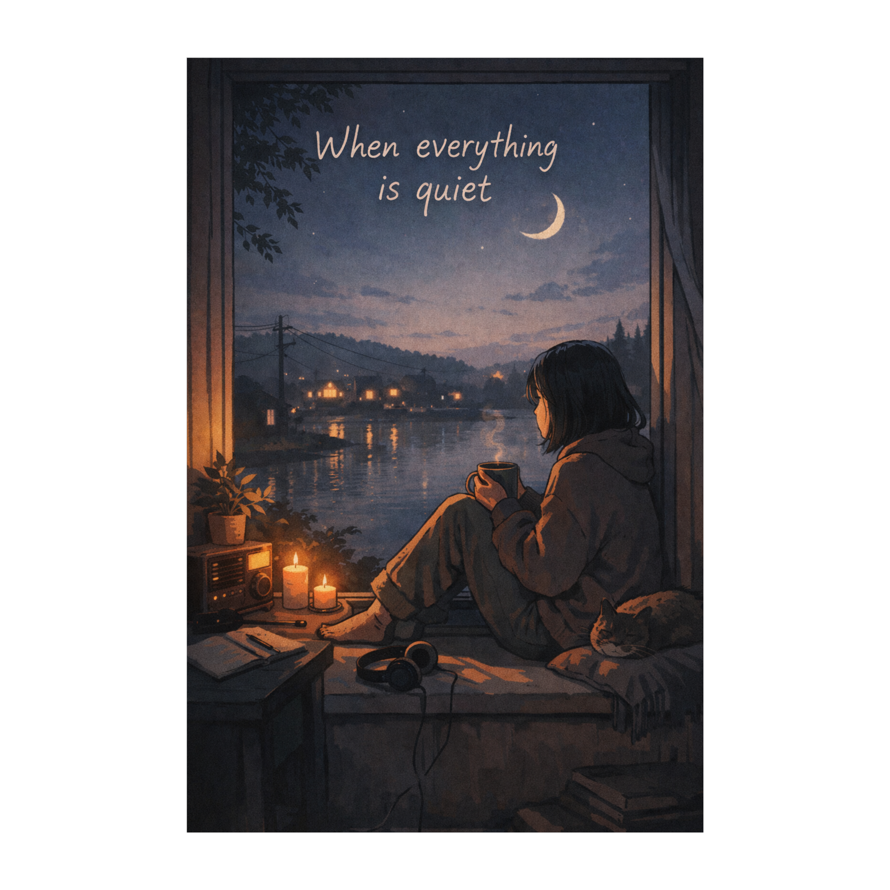 atmospheric chill lofi, vinyl crackle, gentle rain background, warm vintage synth pads, soft electric guitar, melodic, 70 bpm, E Major