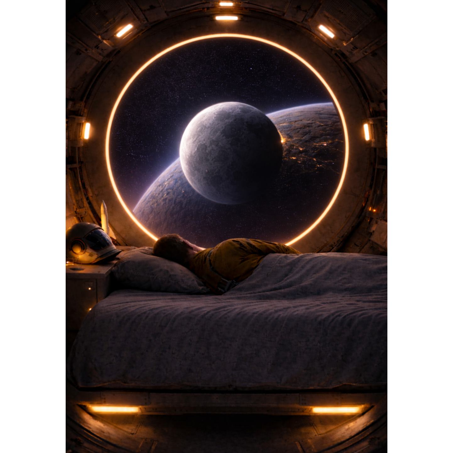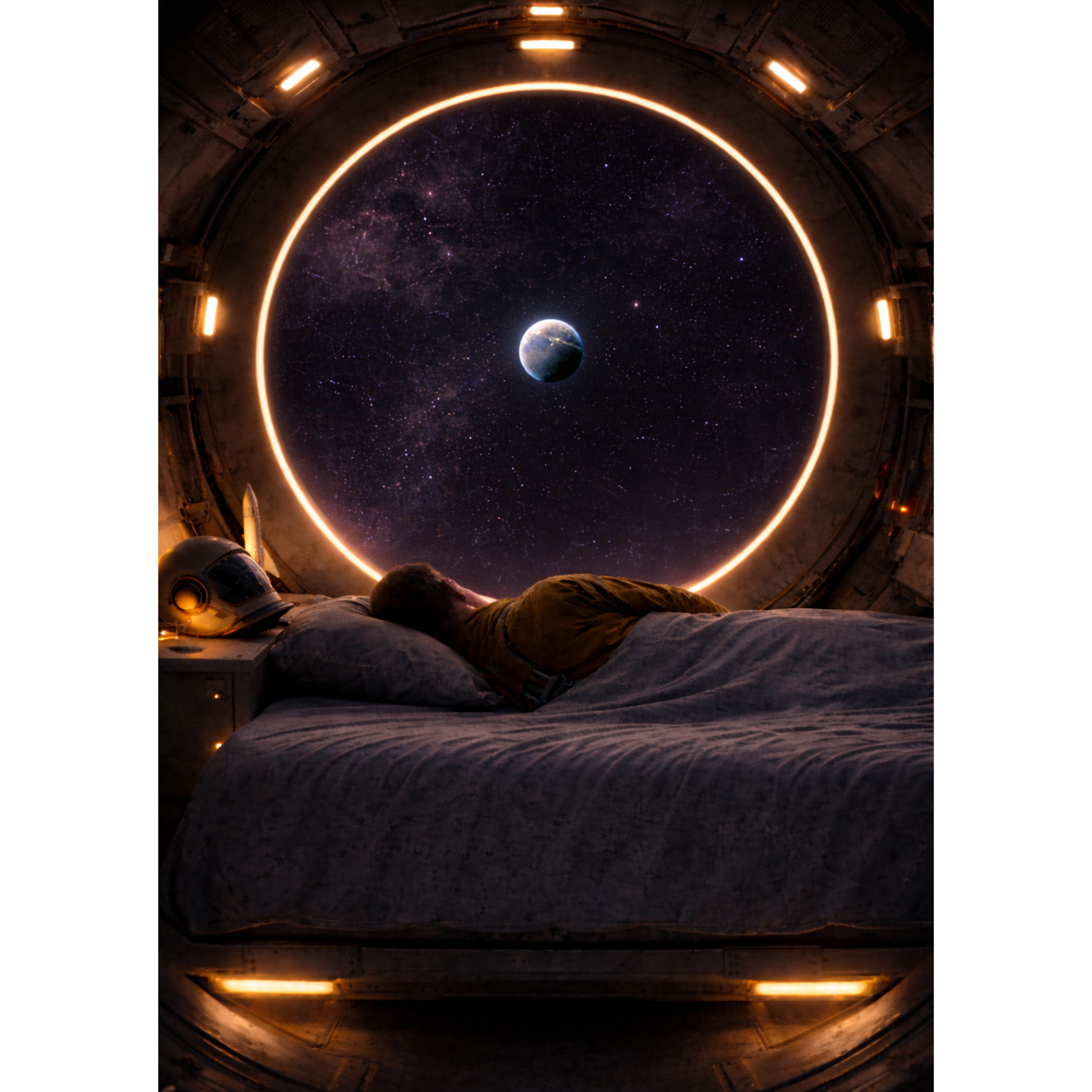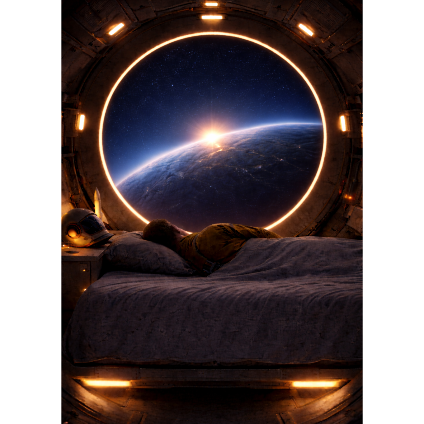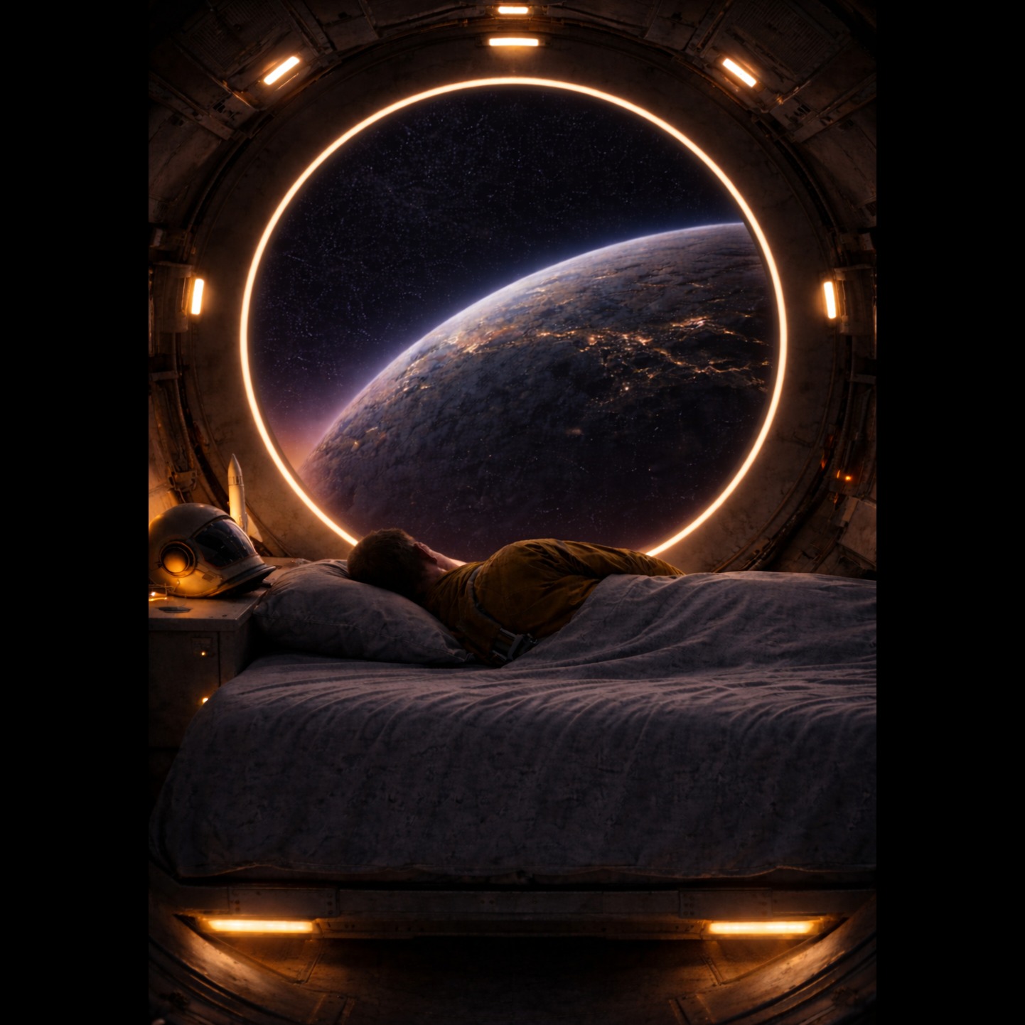 Atmospheric ambient sleep music with a futuristic space feel, Warm evolving analog synth pads with slow movement, gentle 55–60 BPM soft electronic pulse with rounded low transients, subtle brushed percussion texture, 3–4 note repeating melodic motif on a warm synthetic bell with long reverb and soft delay, deep gentle sub bass drone, calming alpha binaural tone drifting from 9 Hz toward 8 Hz, low dynamic range, smooth transitions, immersive orbital atmosphere, subtle spacecraft hum, intimate and grounded, relaxing but still awake, no sharp hits or dramatic builds