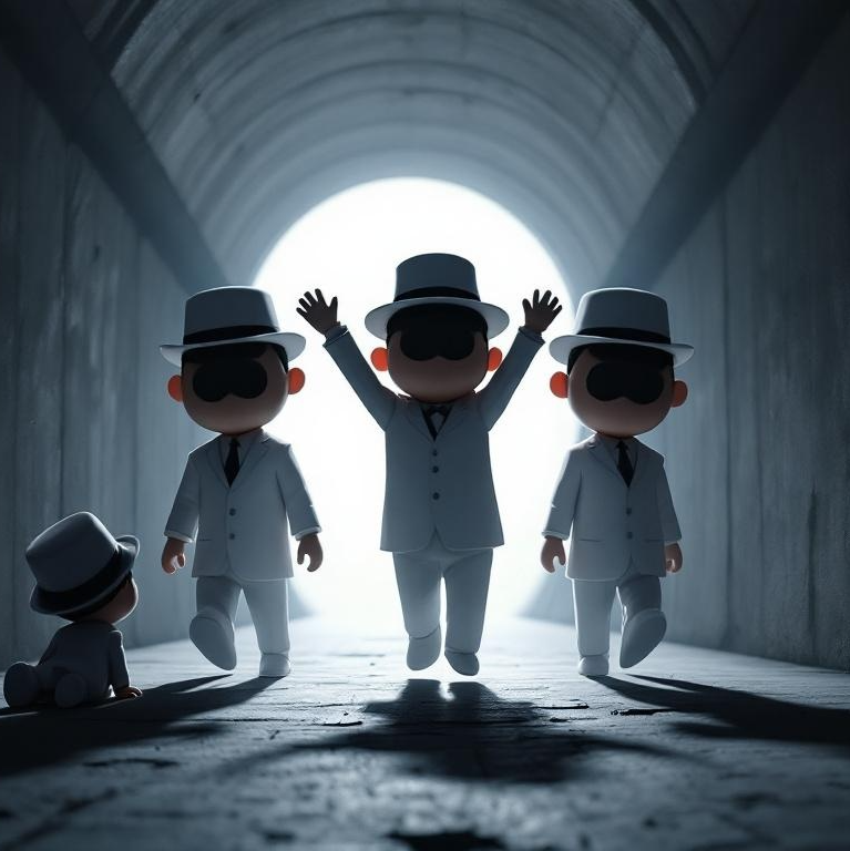 Opening with a glitchy, detuned music box interlaced with monstrous growls, breath, and subtle glockenspiel, the song maintains ominous drones as a constant bed, Gothic harp arpeggios slither in, supporting circus-core percussion with a dark cabaret swing, Cello swells and haunted choir harmonies intensify the gothic folk atmosphere, The narrative advances through theatrical, syncopated progressions and eerie transitions, culminating in a macabre fairytale waltz with deep bass drops, layered unsettling synths, punchy bass, sharp snares, and drastic 75-135 bpm tempo shifts, Shaky, whispering vocals heighten fear, a childrens choir sings lullabye with dramatic impacts and hard-hitting drums, breathy vocals, tension, distorted bass, cinematic tension, punchy kicks, fast hi-hats, minimal drums, dynamic builds, whispers, commanding haunting synths, dramatic strings, a transcendent thriller, dark vibes, dual vocals, static, frantic, syncopated drums, echoes, risers, raspy male vocals, danger
