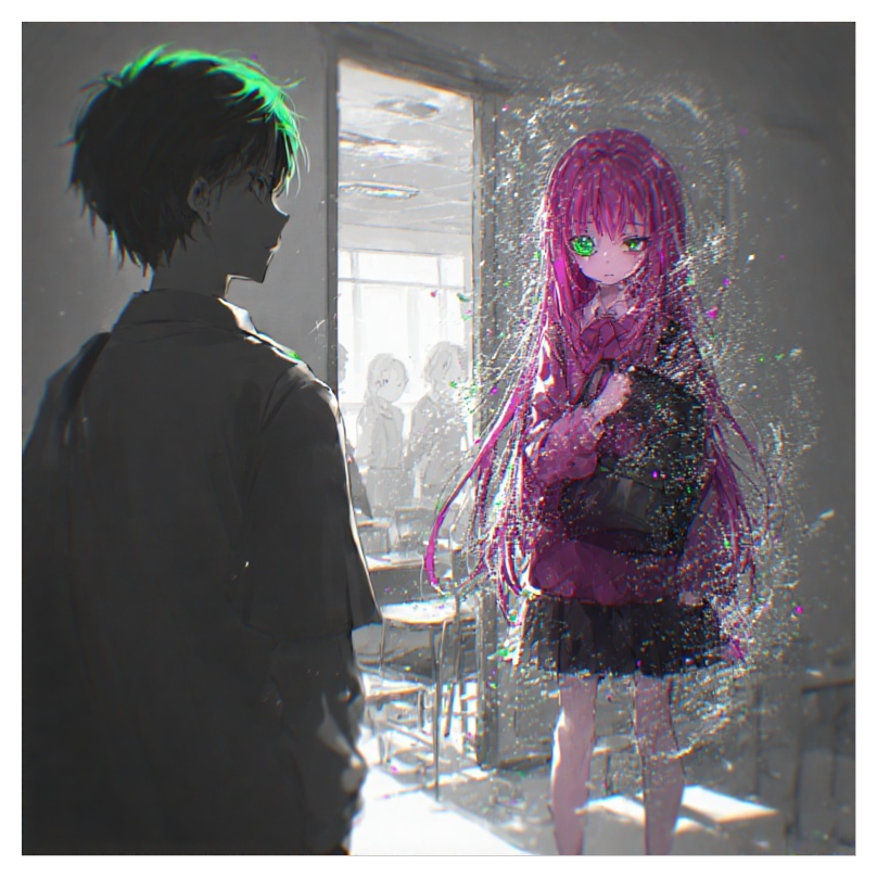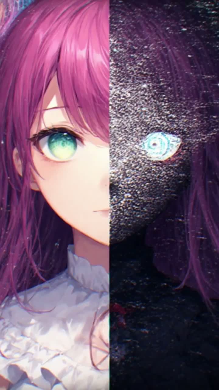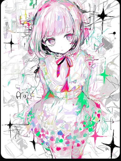 Glitchcore + acid break track builds on rapid-fire breakbeats and pulsing acid synth lines, Looping glitchy minor chords create an off-kilter bed, with soft young anime female vocals contrasted by chopped, fragmented glitch vocal samples, Stutter FX and pitched fragments add a kawaii yet twisted edge, Layers of surreal synth textures and complex rhythmic edits heighten the dreamlike, disorienting atmosphere, ‑low quality