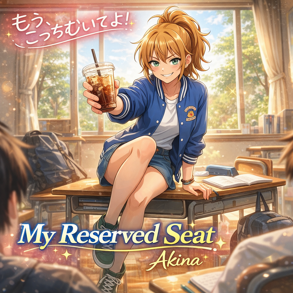 Upbeat synths and a bouncy rhythm section create a lively mid-tempo J-Pop groove, accented by sparkling glockenspiel and playful sound effects like pencil taps, sneezes, and gasps, The arrangement pulls back to light pads and minimal percussion for spoken lines, then bursts back with layered harmonies, bright guitars, and energetic drums for catchy sung sections
