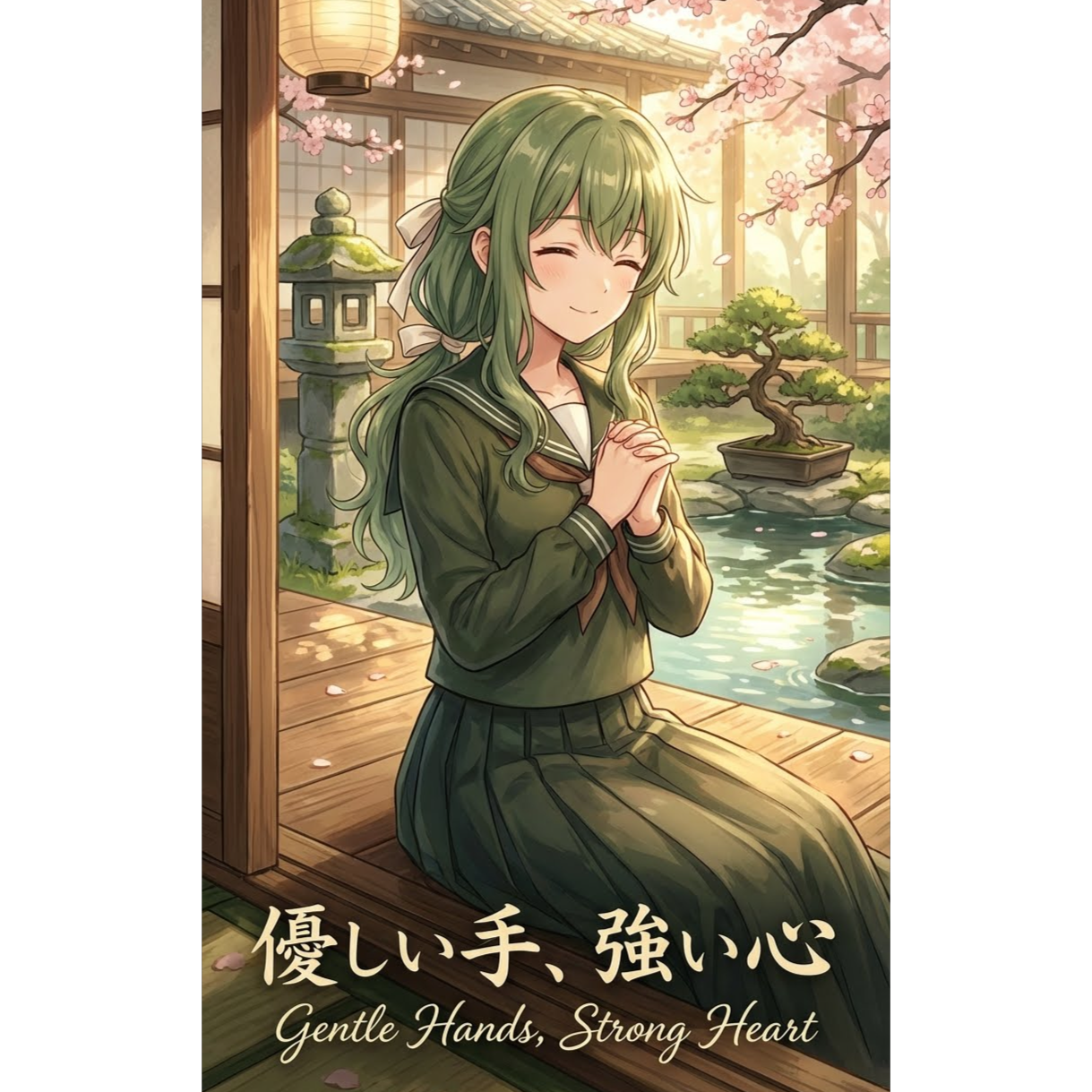 A beautiful fusion of traditional Japanese instrumentation and modern pop-rock that embodies duality and balance, The lead vocalist has a naturally soft, warm, and nurturing voice with a mid-range tone that feels like a comforting embrace - gentle and motherly but with underlying strength, Her delivery is calm and soothing in verses, building to powerful, unwavering conviction in choruses without losing its warmth, Features delicate koto (Japanese harp) and shakuhachi flute in verses creating a peaceful, meditative atmosphere with soft acoustic guitar fingerpicking, Pre-chorus introduces subtle taiko drums that build tension, Chorus explodes with full rock band, soaring strings, and powerful vocals that showcase hidden strength while maintaining grace, Bridge features traditional instruments solo before final epic chorus, The song flows like water - gentle ripples that can become a protective wave, Inspiring, nurturing, and deeply emotional, Lead Vocal of a gentle, 16 y, o, girl