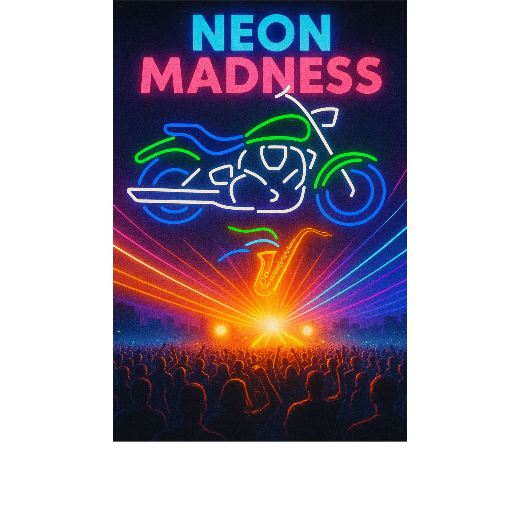 Festival house × progressive EDM × party mashup anthem, Male + female vocals — playful chant hooks, soulful toplines, and soaring festival belts, Blend euphoric progressive house chords, deep house grooves, and tech-house basslines with trap-style hype shouts and vocal chops, Includes: melodic plucks, funky sax riffs, disco-house percussion, crowd-chant breakdowns, and massive supersaw festival drops, Drops combine vocal chops (“neon madness, turn it up”) with rolling bass and sidechained synths, Mood: high-energy, reckless, and euphoric — built for late-night festivals where the world spins, bodies jump, and every track collides into one unstoppable party