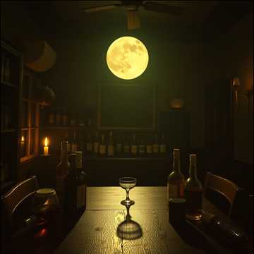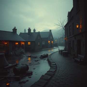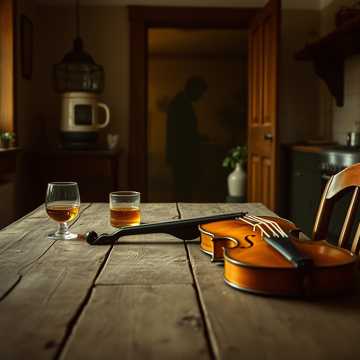 Music begins: A solitary, melancholic fiddle melody (like "The Skye Boat Song") slowly unfolds, then is joined by the warm, ambient drone of a harmonium, The steady, welcoming thump of a bodhrán fades in, The fiddle melody brightens, becoming a lively, tavern-ready reel, It plays for 16 bars